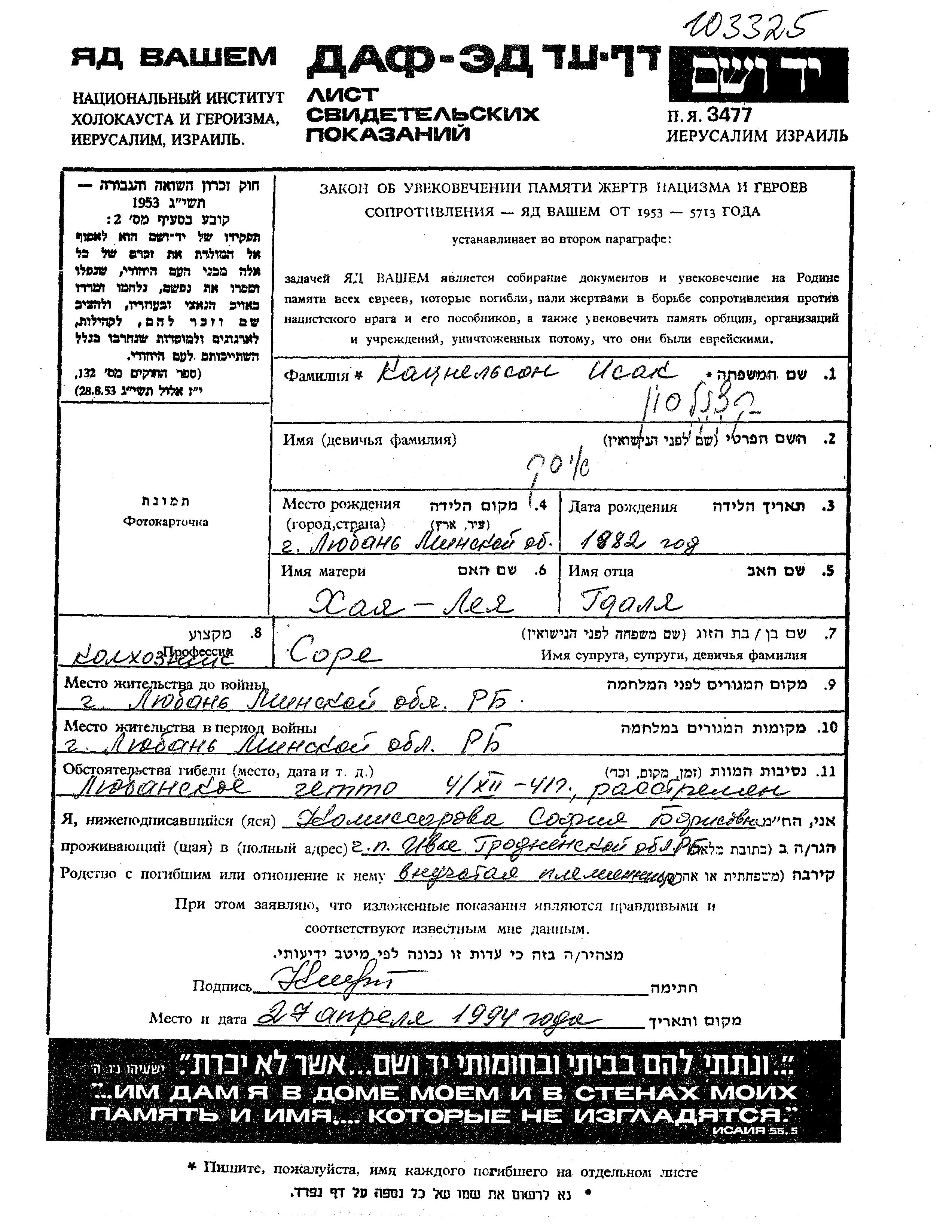Isak Katznelson wurde im Jahr 1882 in Lyuban, Weißrussland (UdSSR) geboren. Er war der Sohn von Gdalia und Khaia Lea. Er war Landwirt und mit Sare Verheiratet. Vor dem Zweiten Weltkrieg lebte er in Lyuban, Weißrussland (UdSSR). Während des Krieges war er in Lyuban, Weißrussland (UdSSR).