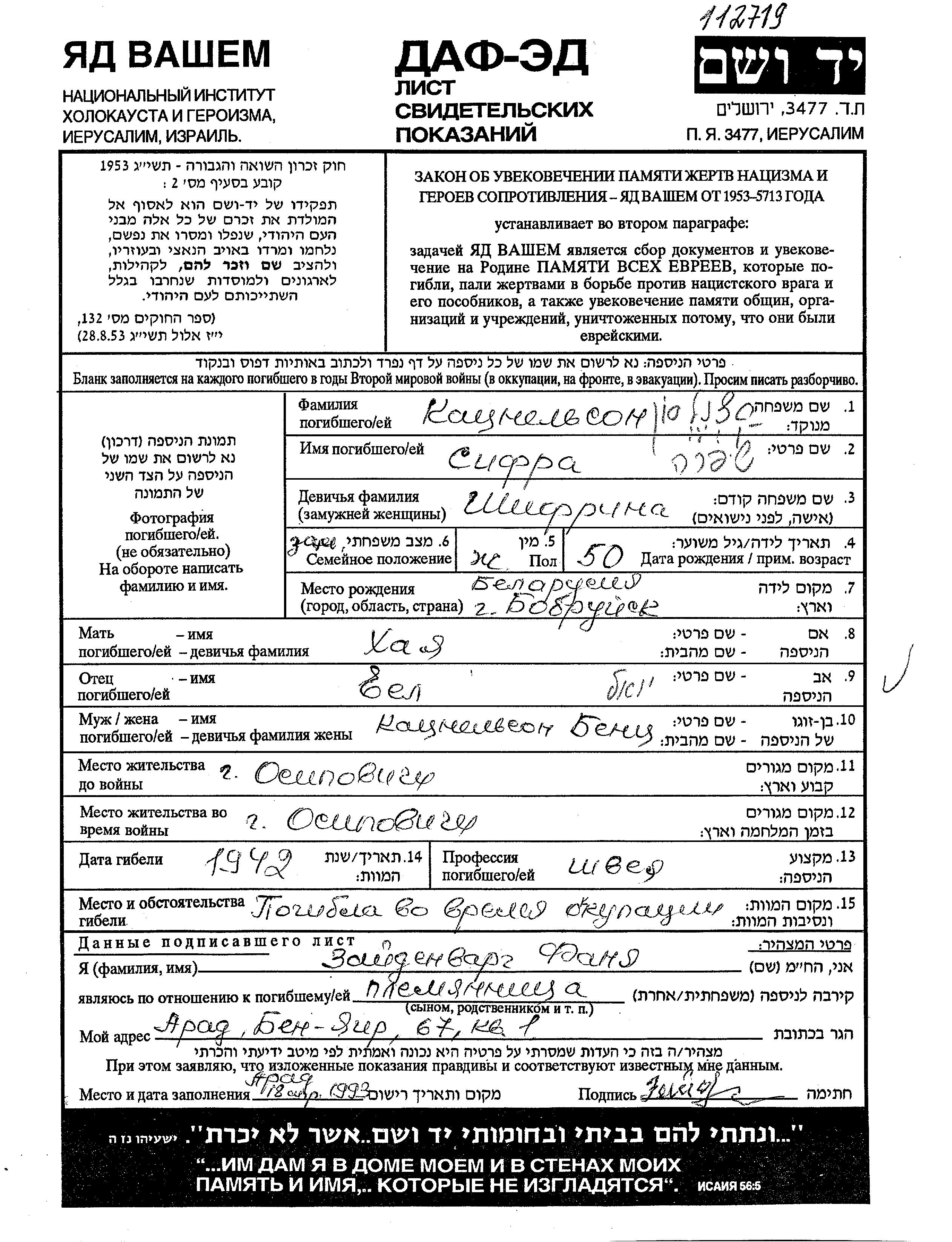 Katznelson Sifra 1892 Osipovichi, Weißrussland (UdSSR) Gedenkblatt
