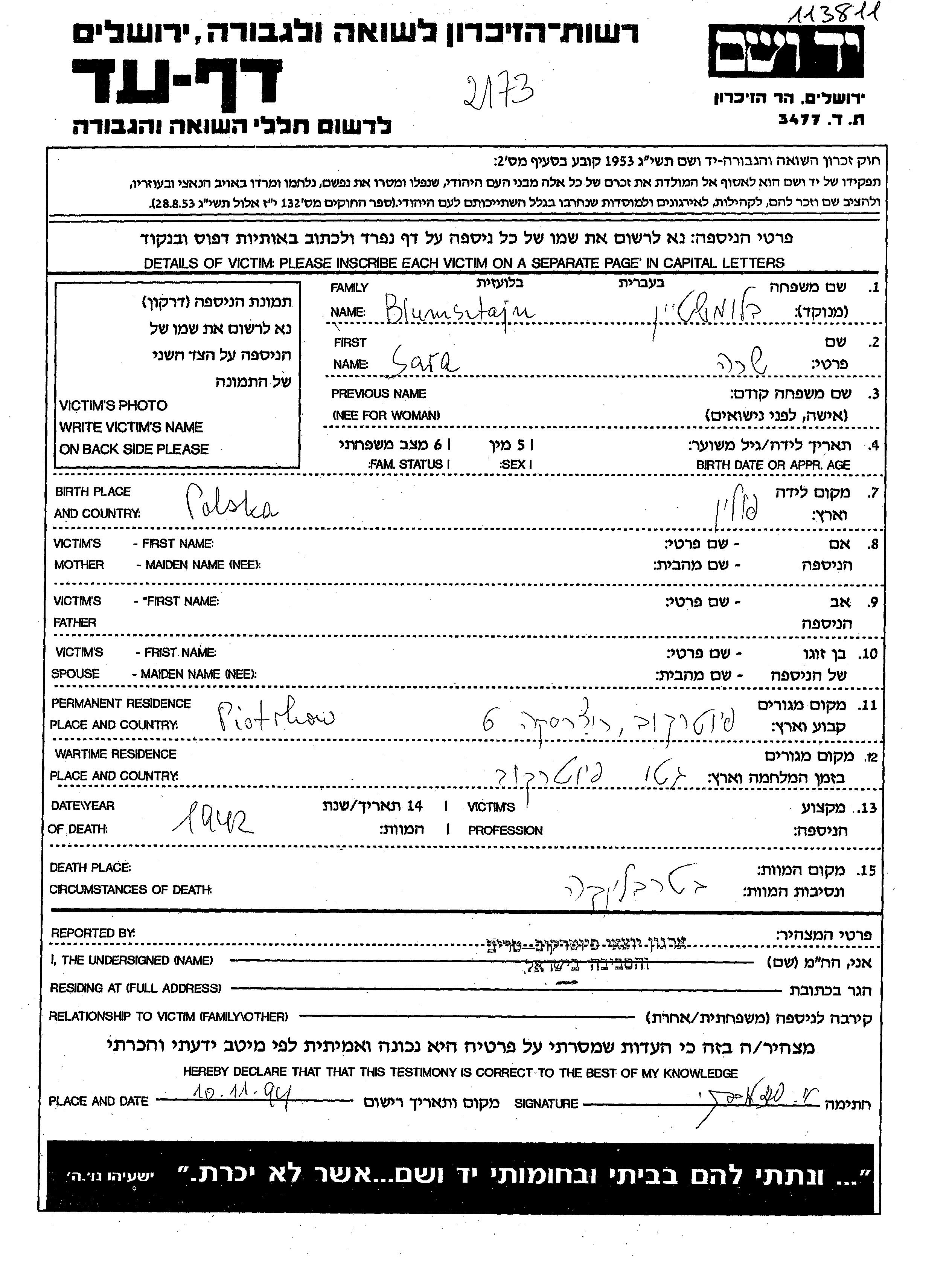 Blumsztajn Sara Piotrkow, Polen Gedenkblatt