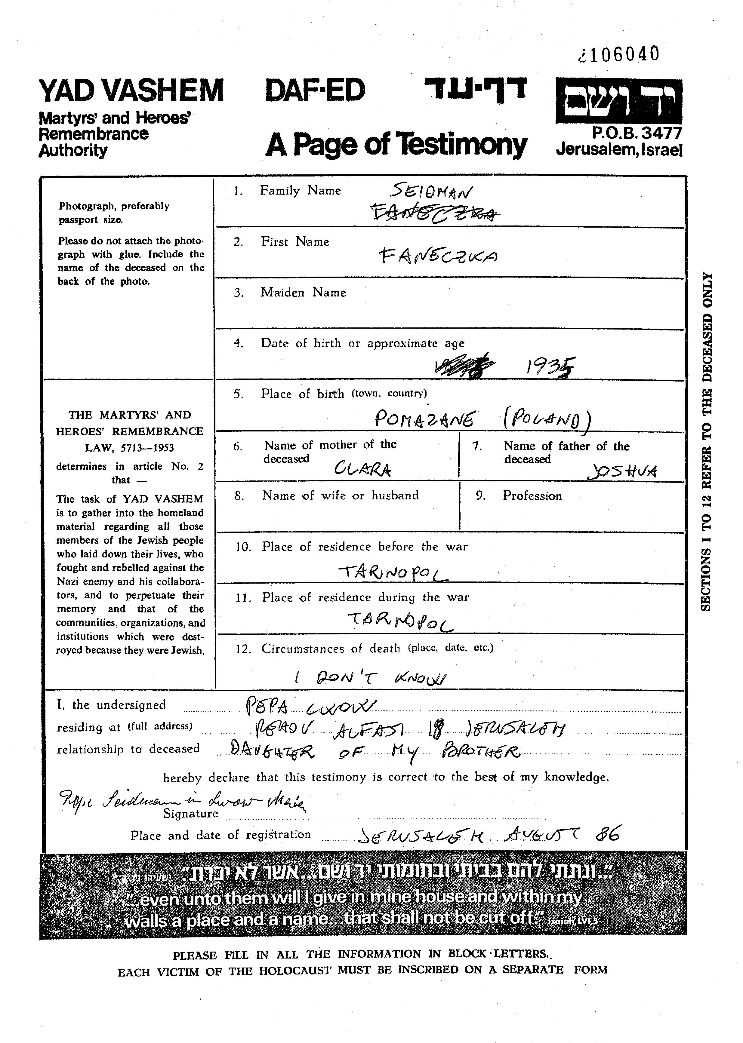 Faneczka Seidman wurde im Jahr 1935 in Pomorzany, Polen geboren. Sie war die Tochter von Joshua und Clara. Sie war Kind. Vor dem Zweiten Weltkrieg lebte sie in Tarnopol, Polen. Während des Krieges war sie in Tarnopol, Polen.