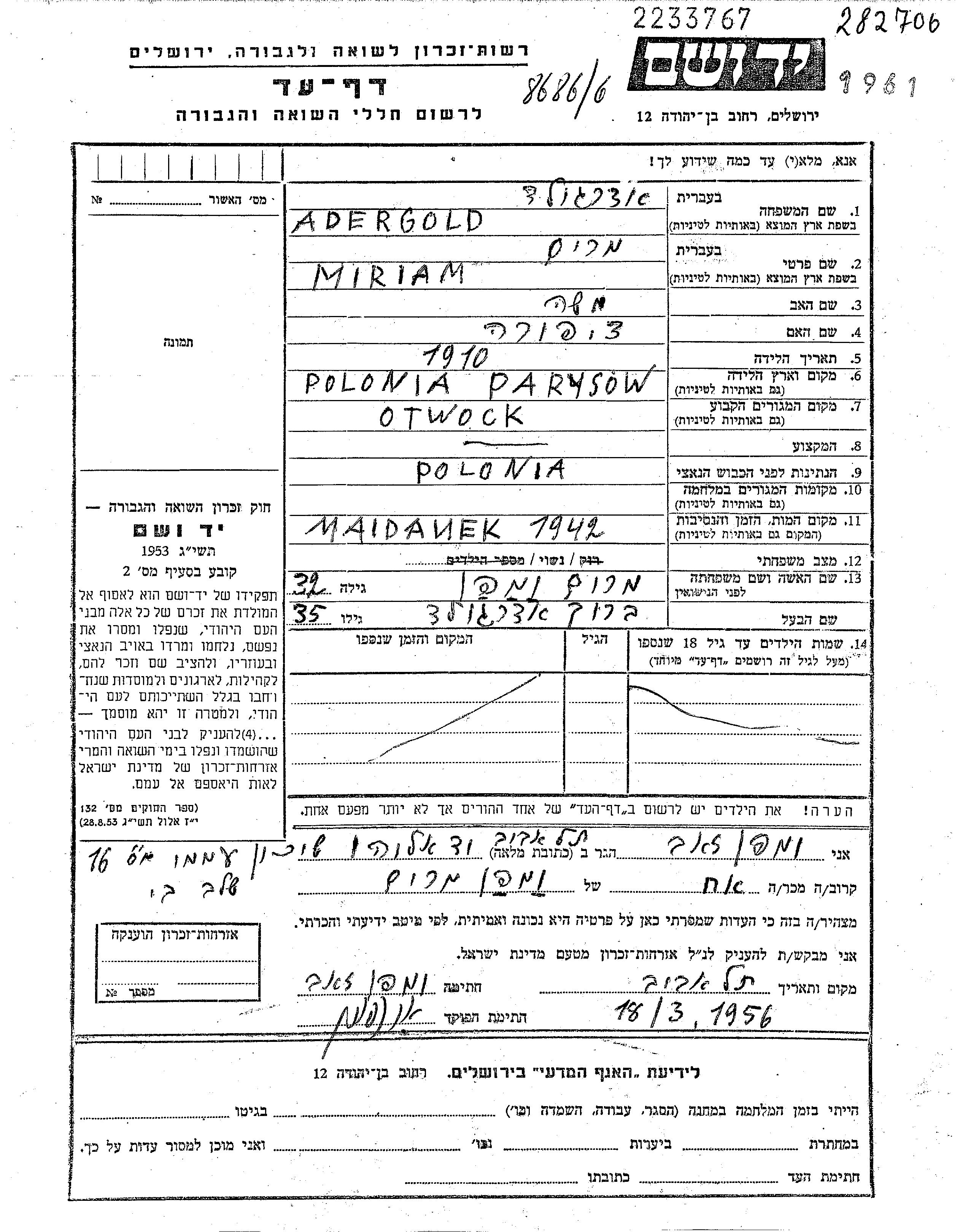 Miriam Adergold wurde im Jahr 1910 in Parysow, Polen geboren. Sie war die Tochter von Moshe und Tzipora. Sie war mit Barukh Verheiratet. Vor dem Zweiten Weltkrieg lebte sie in Otwock, Polen.