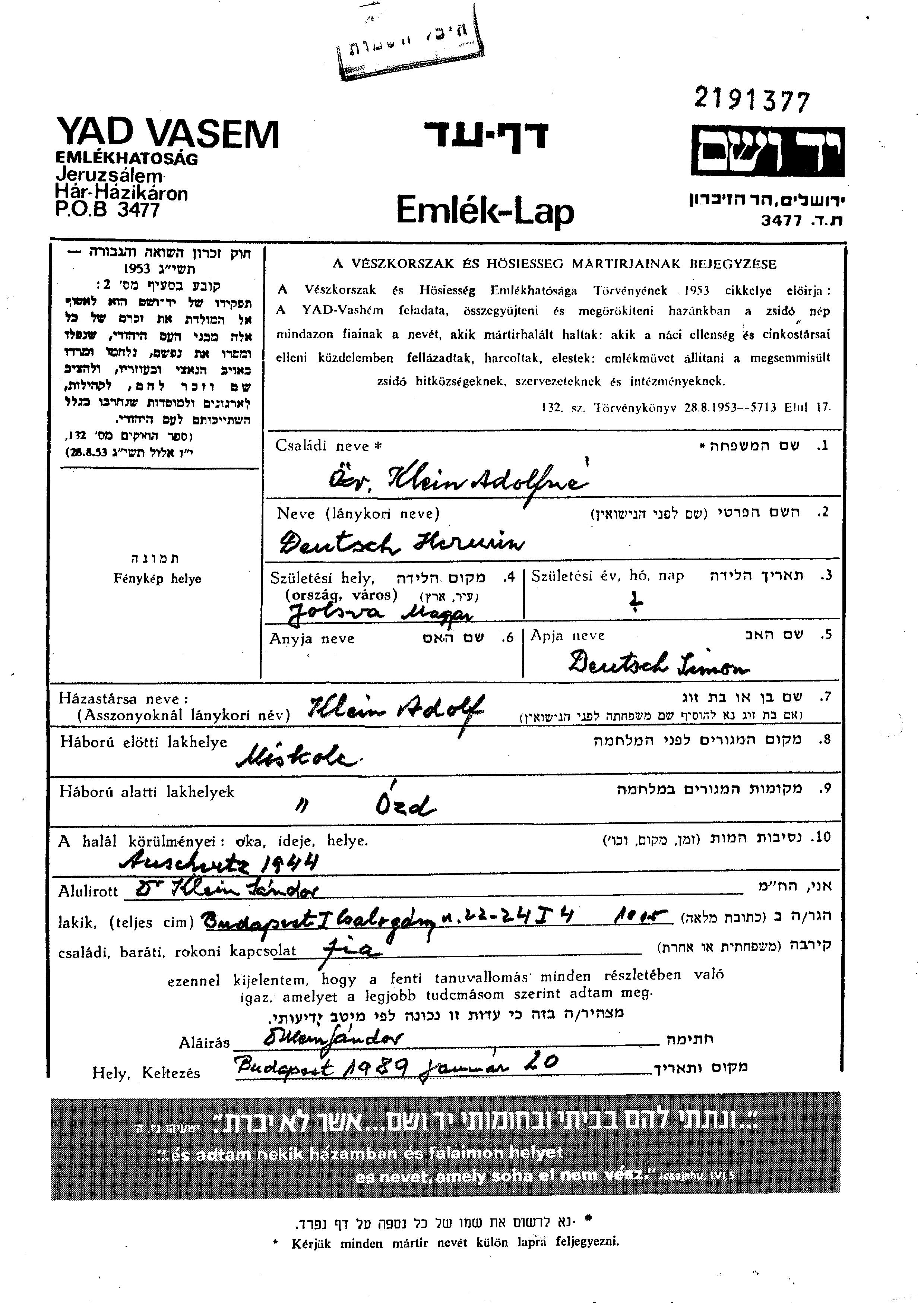Hermin Klein, geb. Deutsch wurde in Jolsva, Tschechoslowakei geboren. Sie war die Tochter von Simon. Sie war mit Adolf Verheiratet. Vor dem Zweiten Weltkrieg lebte sie in Miskolc, Ungarn. Während des Krieges war sie in Miskolc, Ungarn.