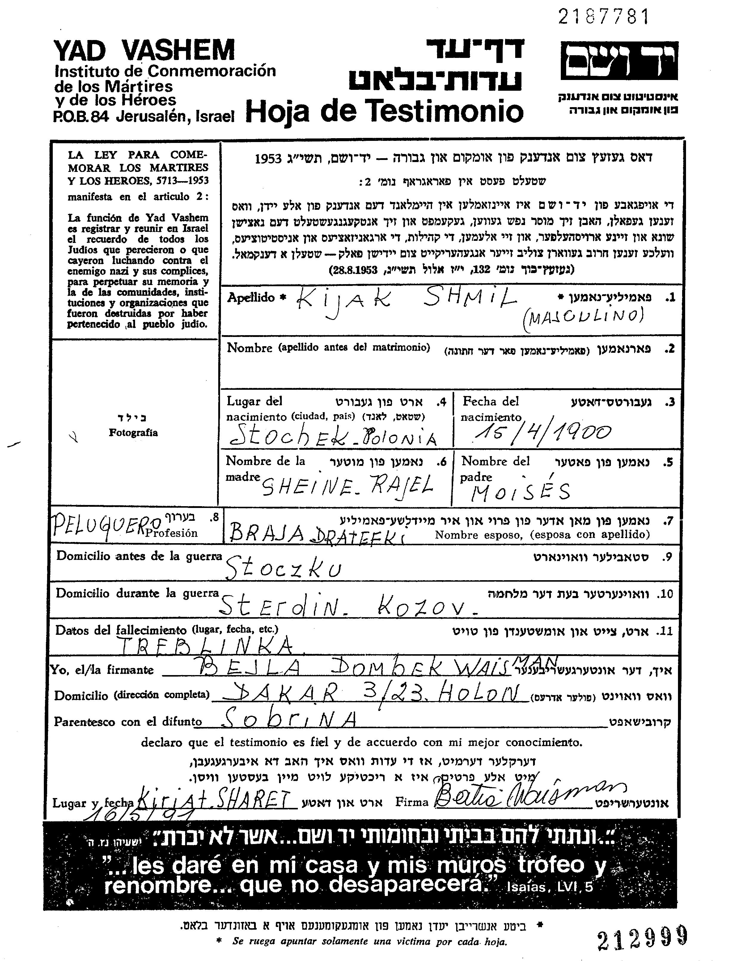 Shmil Kijak wurde im Jahr 1900 in Stoczek, Polen geboren. Er war der Sohn von Moises und Sheine Rajel. Er war Friseur/-in und mit Braja Ber Berta Verheiratet. Vor dem Zweiten Weltkrieg lebte er in Sterdyn, Polen. Während des Krieges war er in Kozow, Polen.