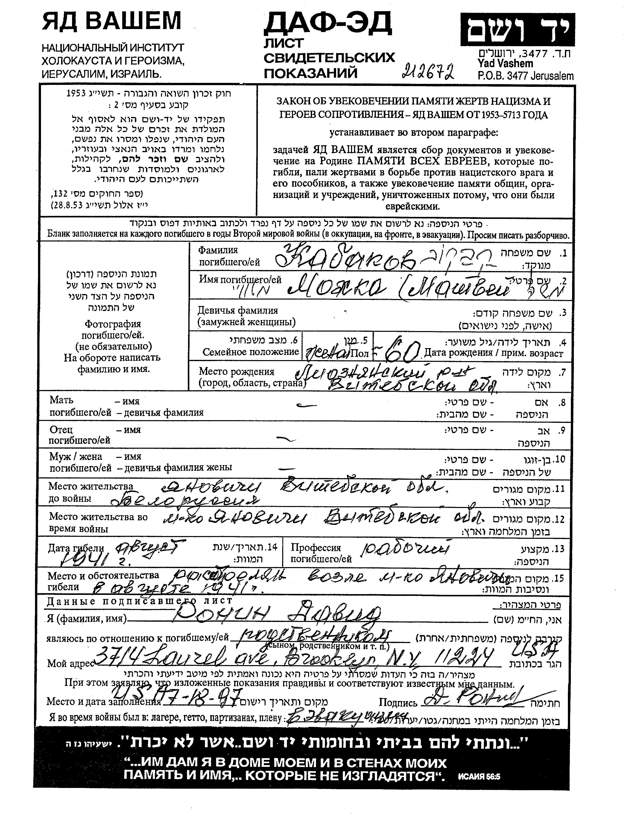 Mozhka Matvei wurde in der Schoah ermordet. Todesort: Yanovichi, Weißrussland (UdSSR) im Jahr 1941.