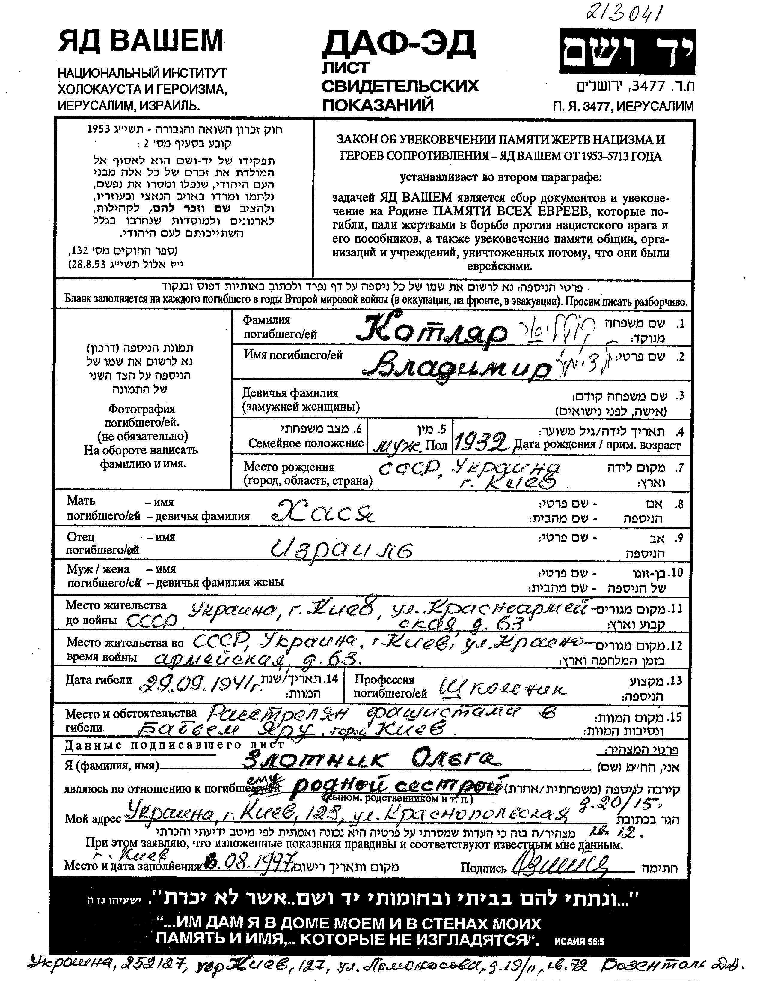 Vladimir wurde in der Schoah ermordet. Todesort: Babi Yar, Ukraine (UdSSR) im Jahr 29/09/1941.