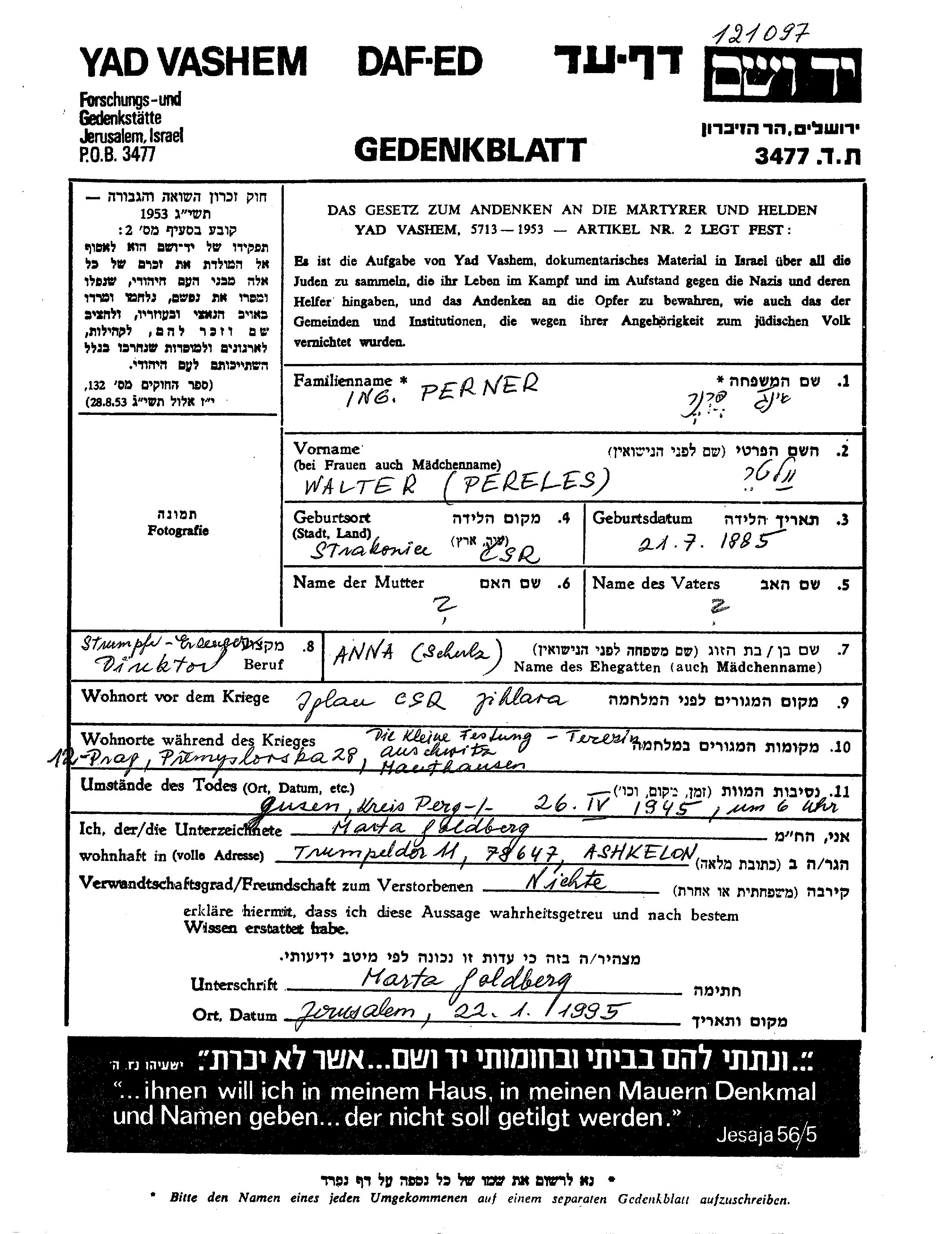 Walter Perner wurde im Jahr 1885 in Strakonice, Tschechoslowakei geboren. Er war Ingenieur und mit Anna, geb. Schulz Verheiratet. Vor dem Zweiten Weltkrieg lebte er in Iglau, Tschechoslowakei. Während des Krieges war er in Prague, Tschechoslowakei.