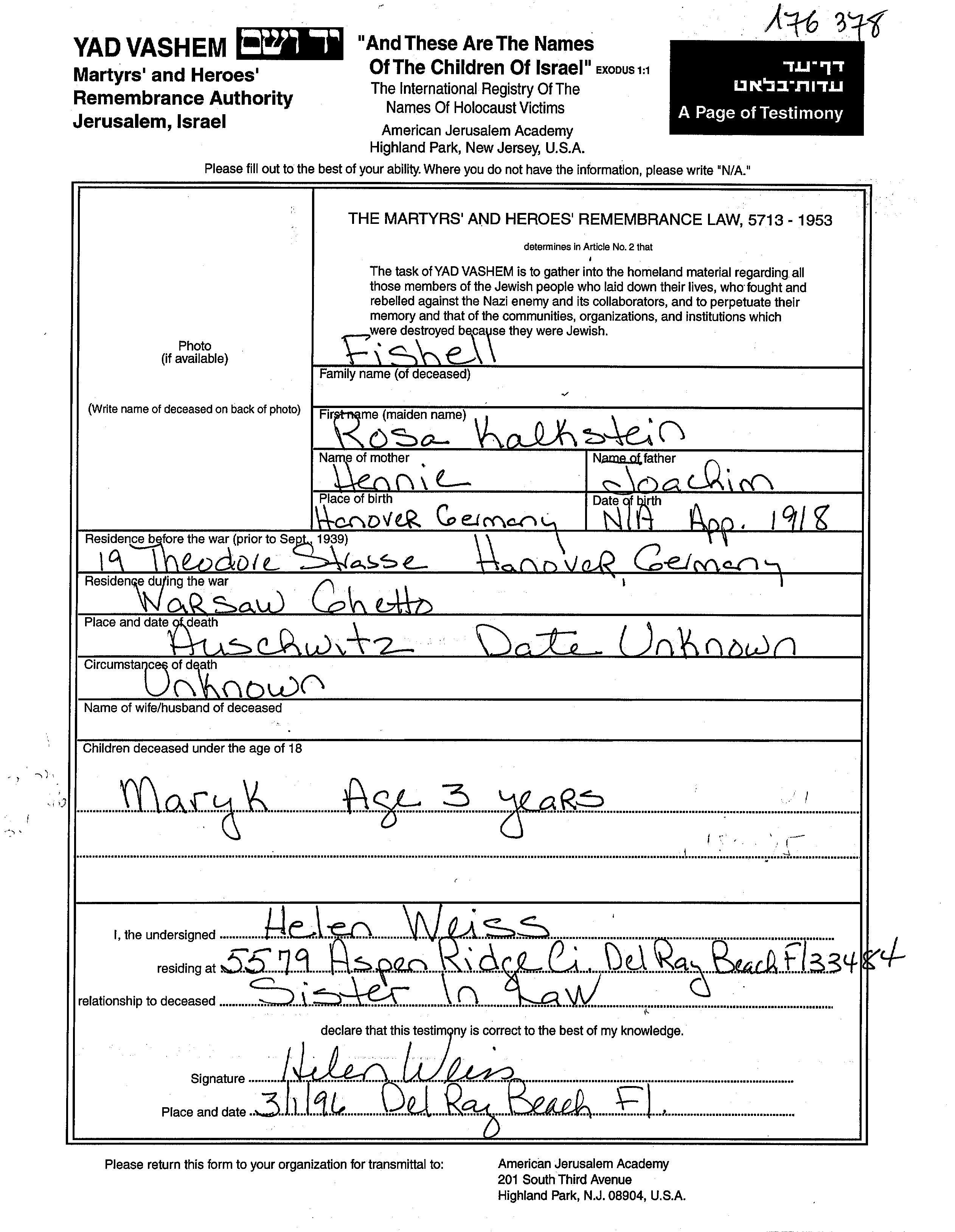Rosa wurde in der Schoah ermordet. Todesort: Auschwitz, Polen.