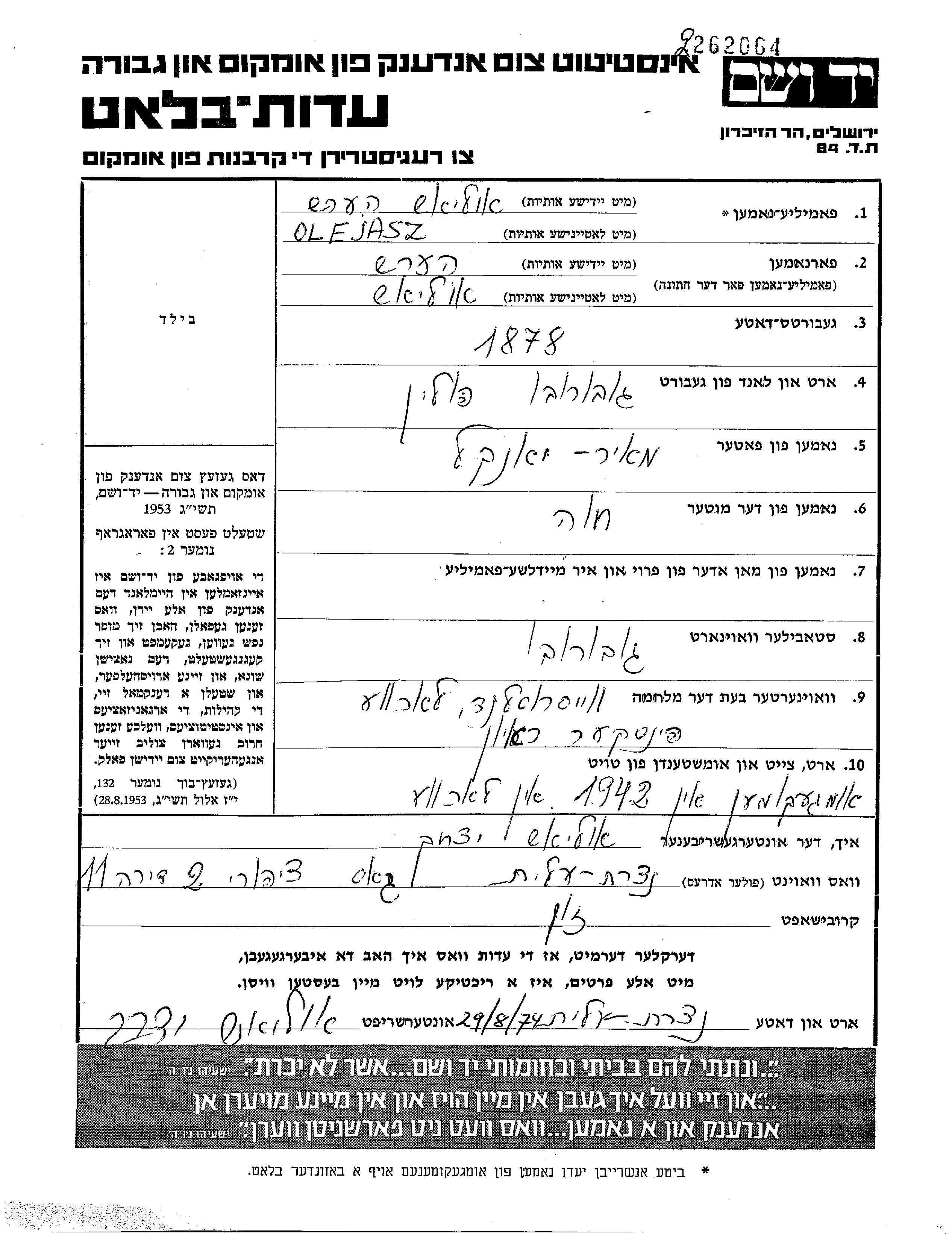 Hersh Olejasz wurde im Jahr 1878 in Goworowo, Polen geboren. Er war der Sohn von Meir Yankel und Khava. Er war mit Toibe Verheiratet. Vor dem Zweiten Weltkrieg lebte er in Goworowo, Polen. Während des Krieges war er in Lachwa, Polen.