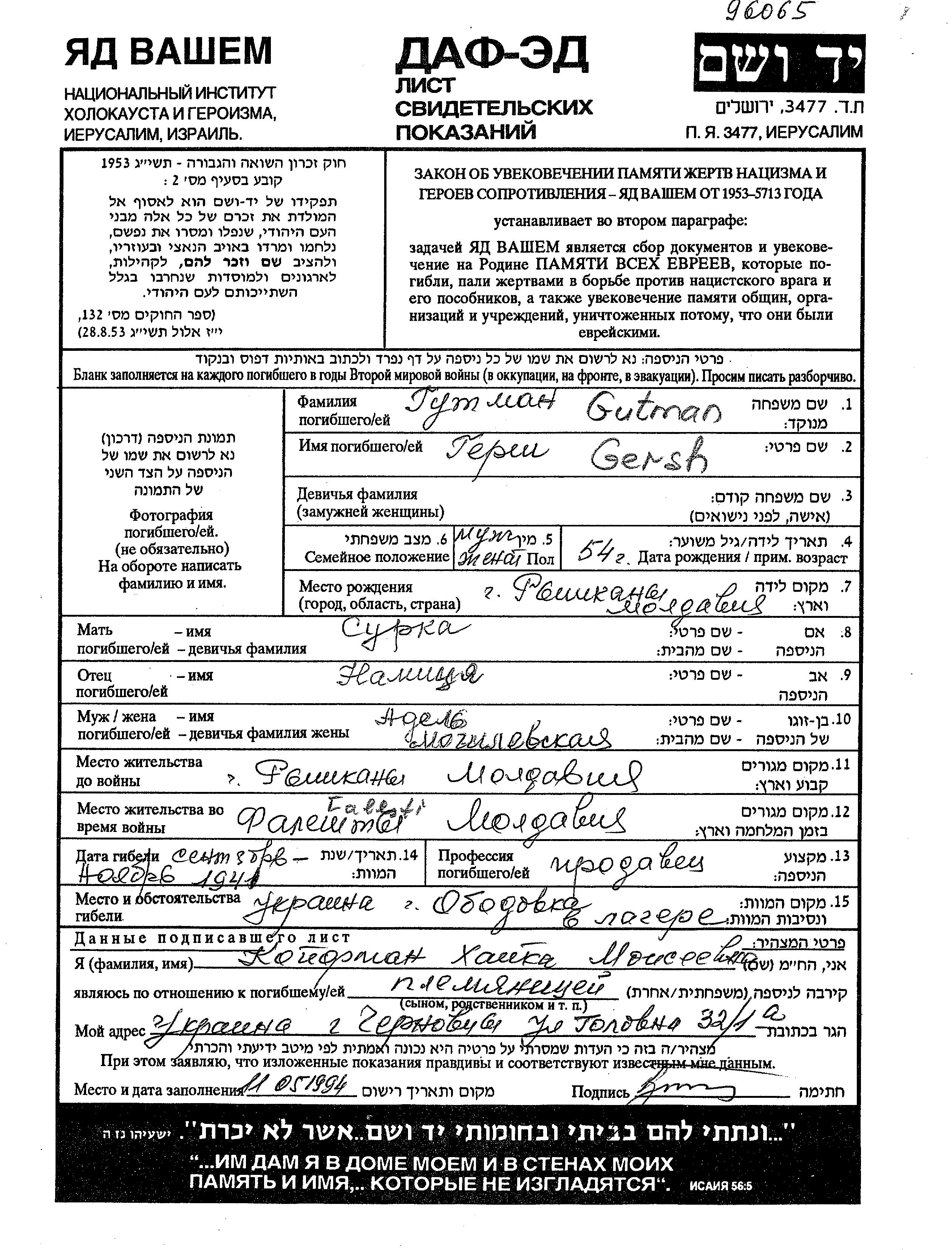 Gersh Gutman wurde im Jahr 1887 in Rascani, Rumänien geboren. Er war der Sohn von Namitza und Surka. Er war Verkäufer/-in und mit Adel Edel Verheiratet. Vor dem Zweiten Weltkrieg lebte er in Rascani, Rumänien. Während des Krieges war er in Falesti, Rumänien.