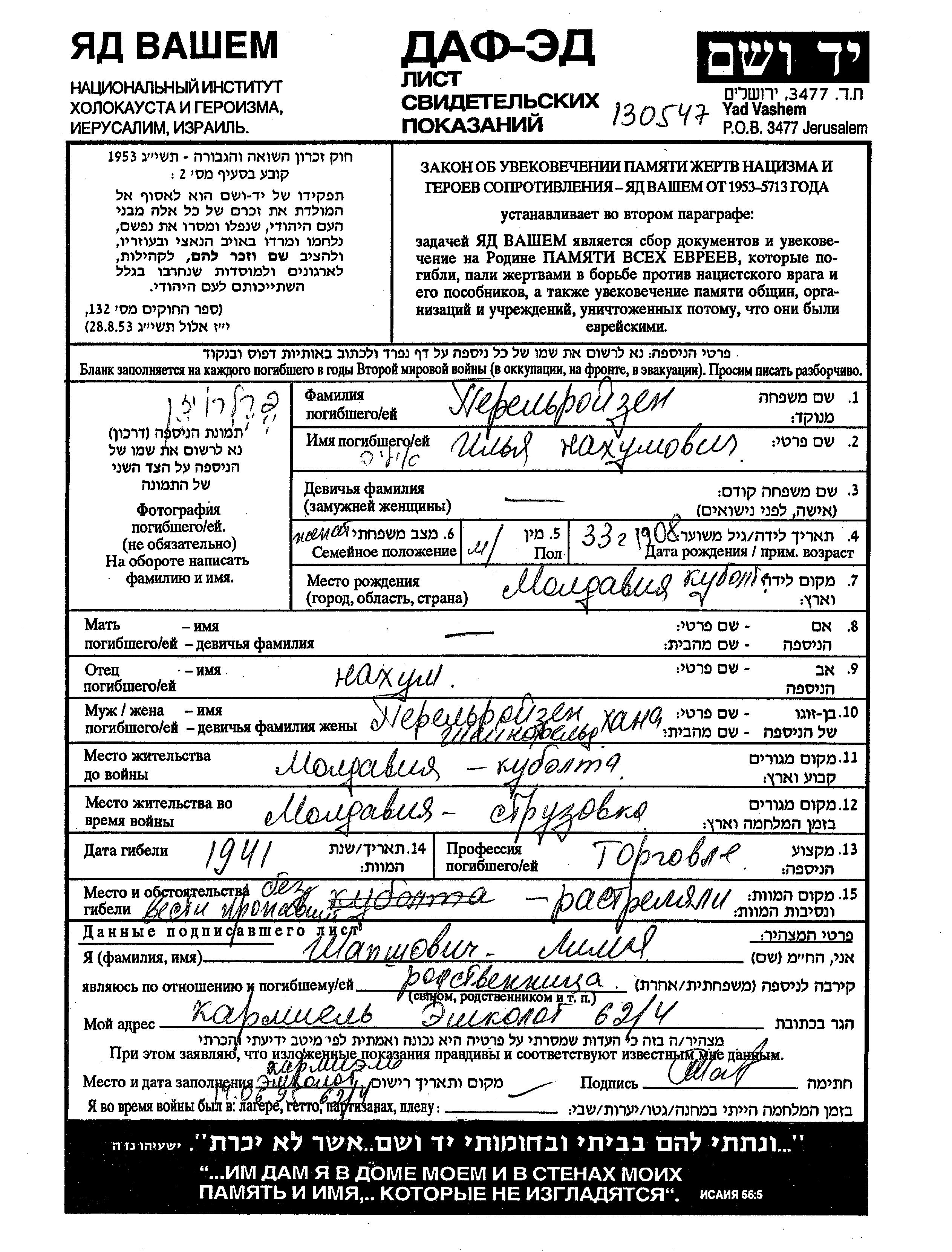 Ilya Perelroyzen wurde im Jahr 1908 in Cubolta, Rumänien geboren. Er war der Sohn von Nakhum. Er war Verkäufer/-in und mit Khana Verheiratet. Vor dem Zweiten Weltkrieg lebte er in Cubolta, Rumänien. Während des Krieges war er in Struzovka, Rumänien.