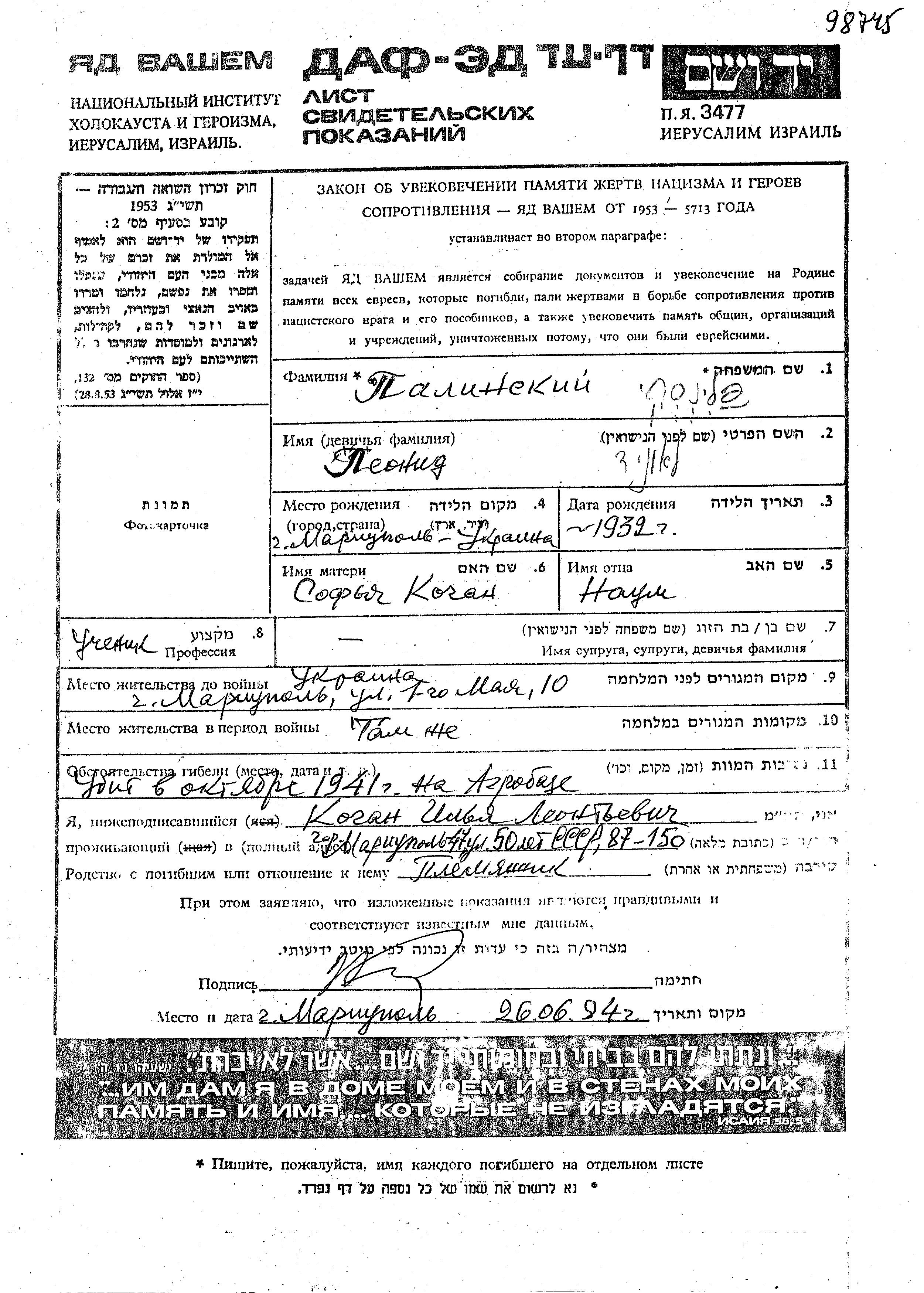 Leonid Palinski Plinski wurde im Jahr 1932 in Mariupol, Ukraine (UdSSR) geboren. Er war der Sohn von Nakhum und Sofia, geb. Kogan. Er war Schüler/-in und Kind. Vor dem Zweiten Weltkrieg lebte er in Mariupol, Ukraine (UdSSR). Während des Krieges war er in Mariupol, Ukraine (UdSSR).