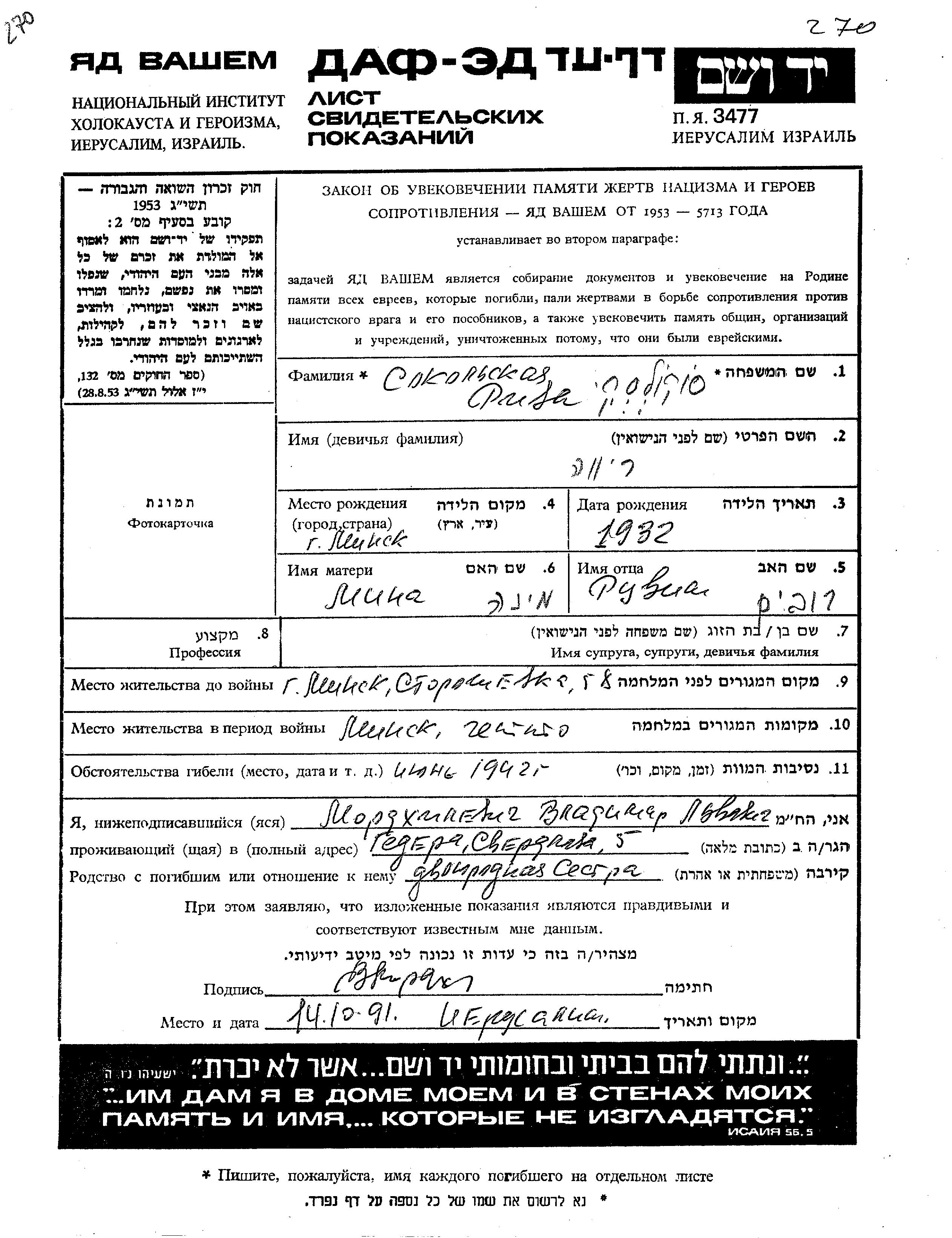 Riva Sokolski wurde im Jahr 1932 in Minsk, Weißrussland (UdSSR) geboren. Sie war die Tochter von Ruvim und Mina, geb. Rabov. Sie war Kind. Vor dem Zweiten Weltkrieg lebte sie in Minsk, Weißrussland (UdSSR). Während des Krieges war sie in Minsk, Weißrussland (UdSSR).