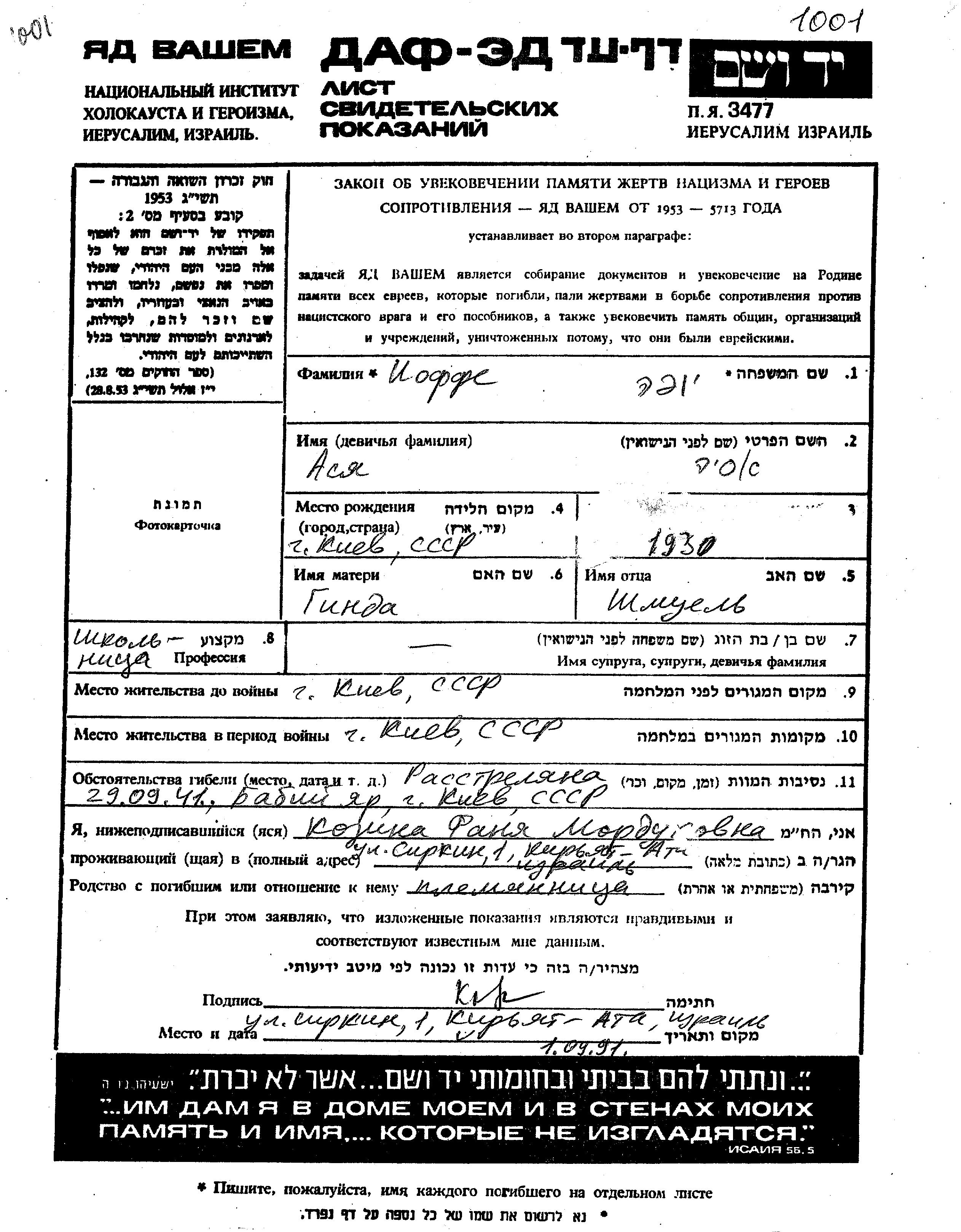 Asia wurde in der Schoah ermordet. Todesort: Babi Yar, Ukraine (UdSSR) im Jahr 29/09/1941.