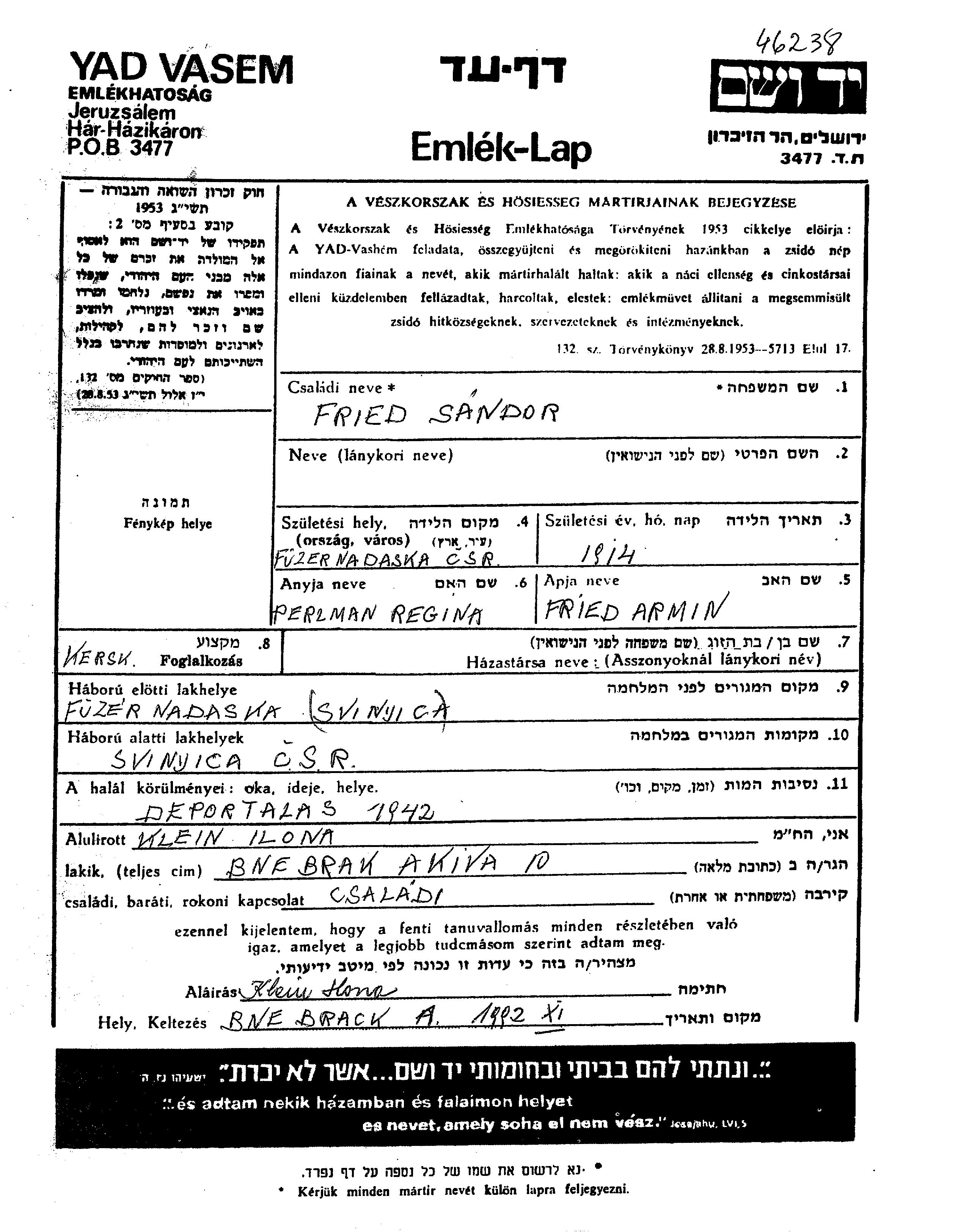 Sandor Fried wurde im Jahr 1914 in Fuzernadaska, Tschechoslowakei geboren. Er war der Sohn von Armin und Regina, geb. Perlman. Er war Kaufmann/-frau. Vor dem Zweiten Weltkrieg lebte er in Fuzernadaska, Tschechoslowakei. Während des Krieges war er in Svinica, Tschechoslowakei.
