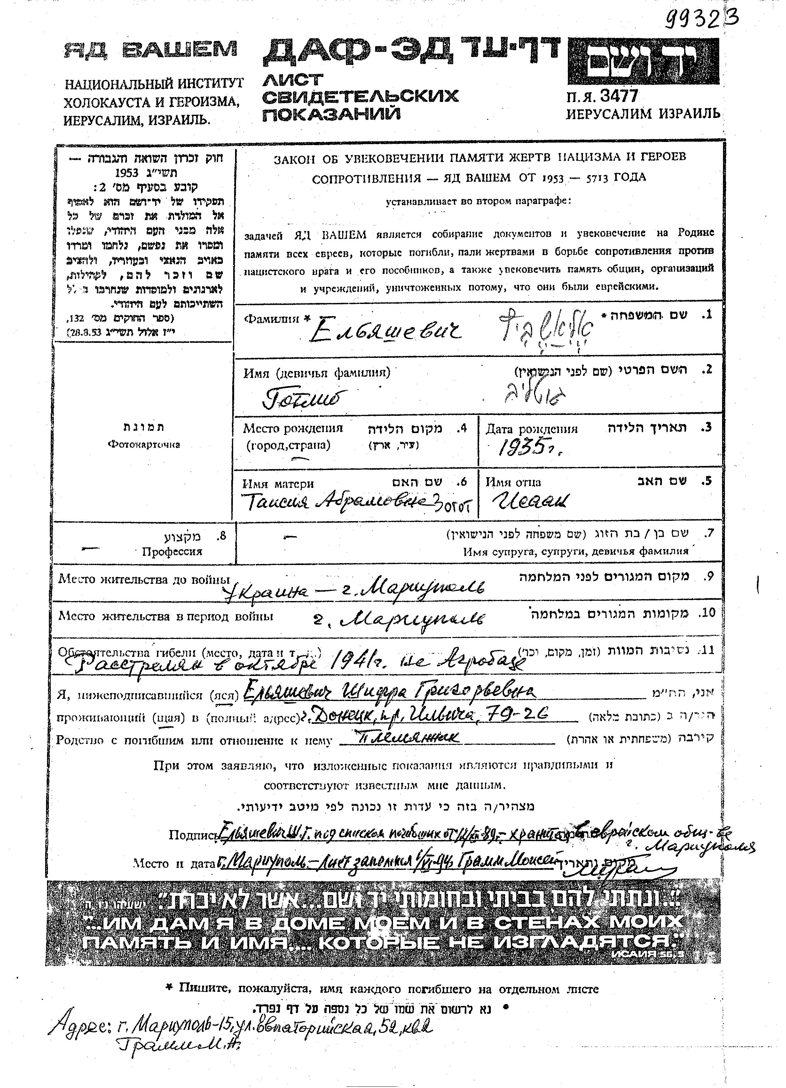 Elyashevich Gotlib 1935 Mariupol, Ukraine (UdSSR) Gedenkblatt