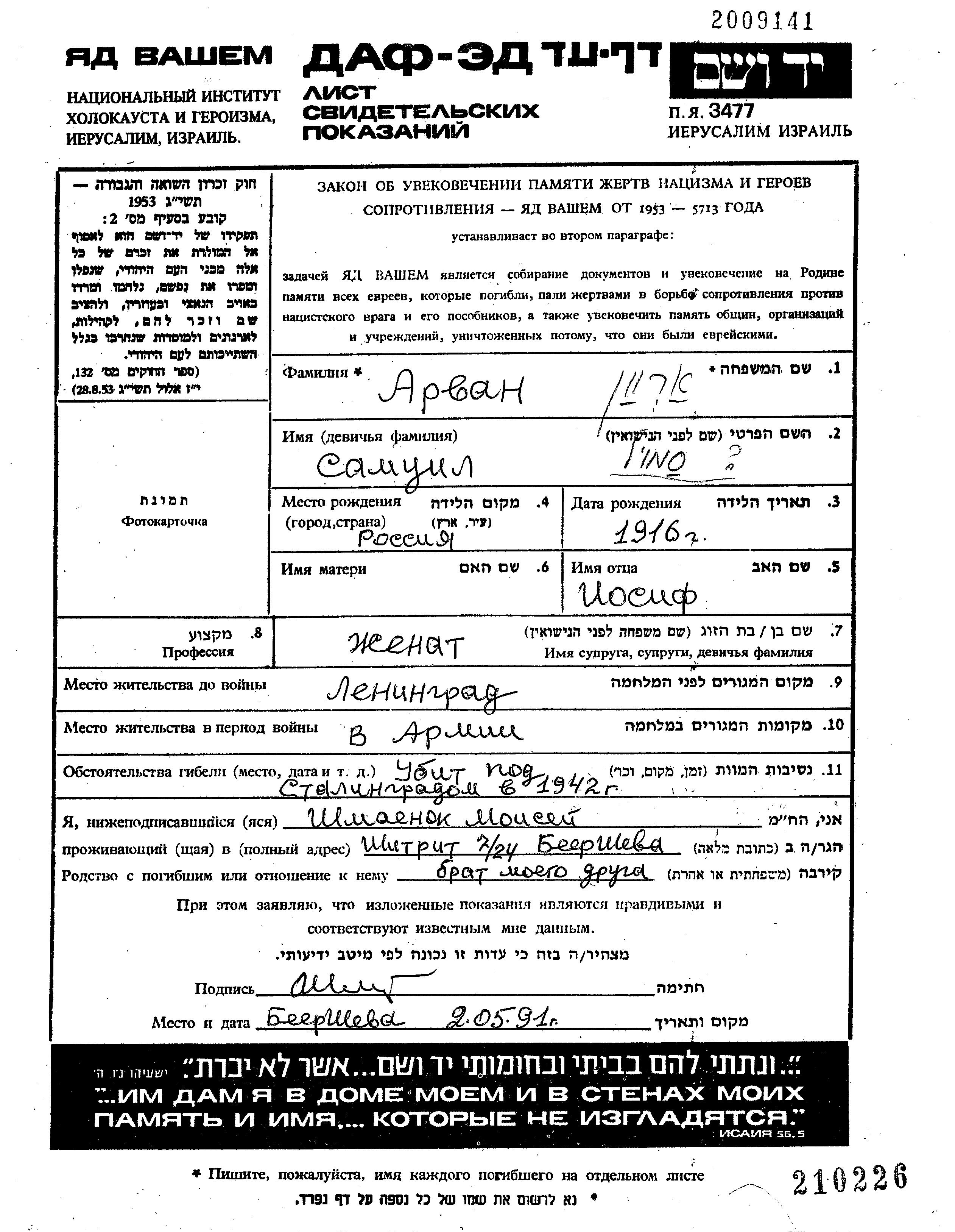 Arvan Samuil 1916 Leningrad, Russland (UdSSR) Gedenkblatt