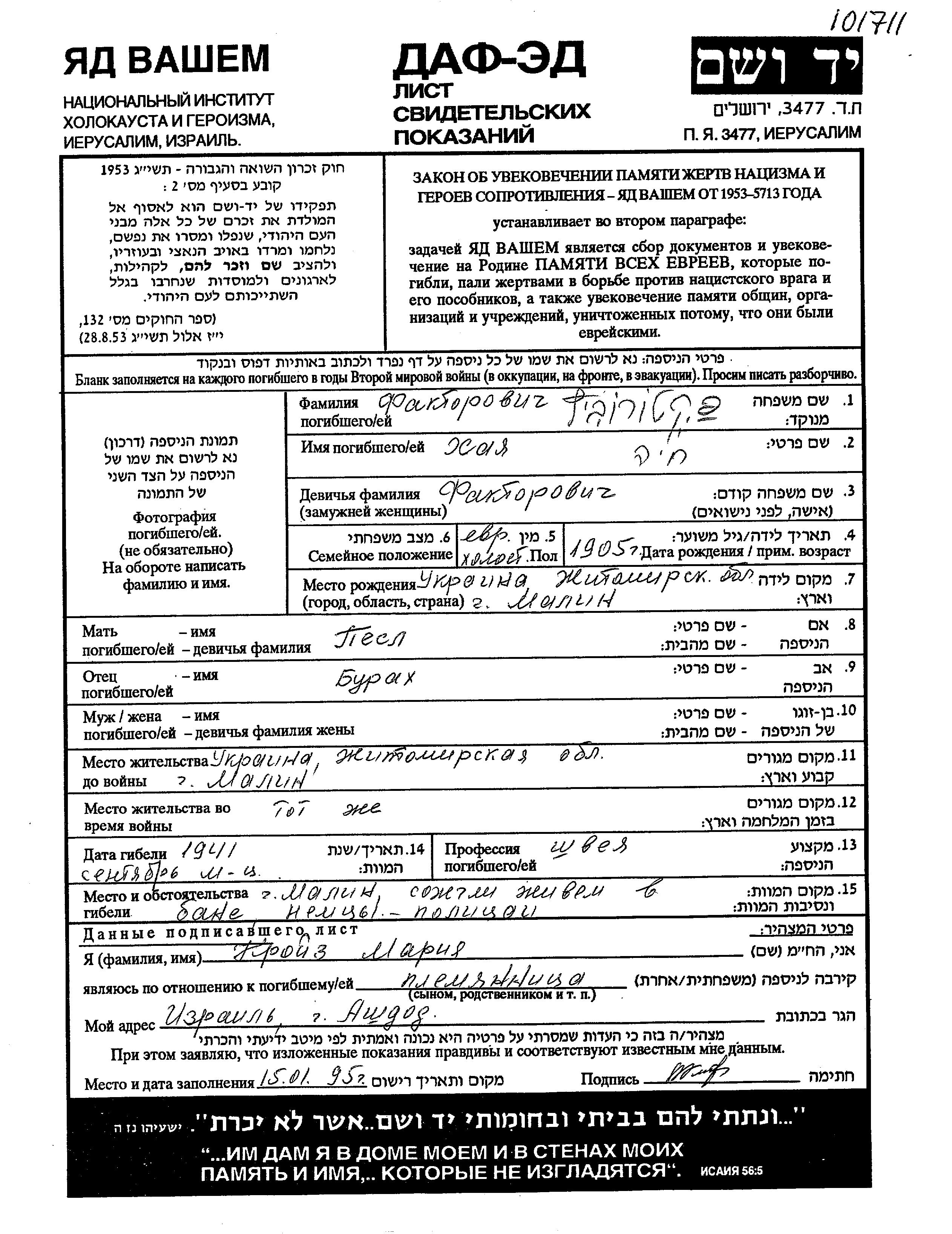 Khaia Faktorovich wurde im Jahr 1905 in Malin, Ukraine (UdSSR) geboren. Sie war die Tochter von Burakh und Pesl Pesel. Sie war Schneiderin und Ledig. Vor dem Zweiten Weltkrieg lebte sie in Malin, Ukraine (UdSSR). Während des Krieges war sie in Malin, Ukraine (UdSSR).