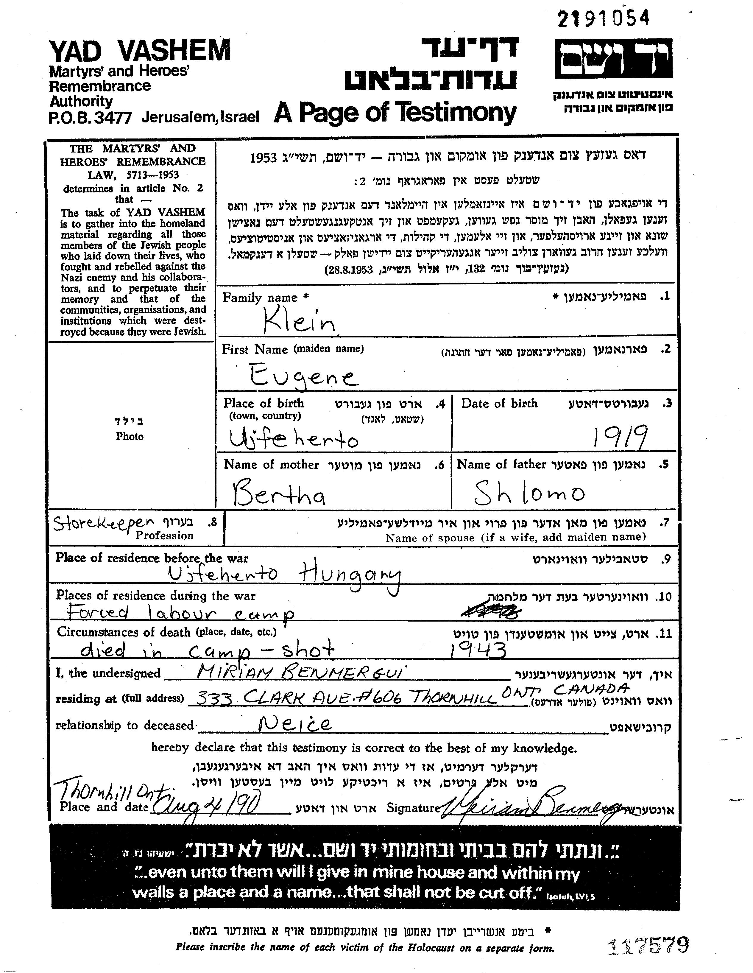 Eugene Klein wurde im Jahr 1919 in Ujfeherto, Ungarn geboren. Er war der Sohn von Shlomo und Bertha. Er war Ladenbesitzer/-in. Vor dem Zweiten Weltkrieg lebte er in Ujfeherto, Ungarn.