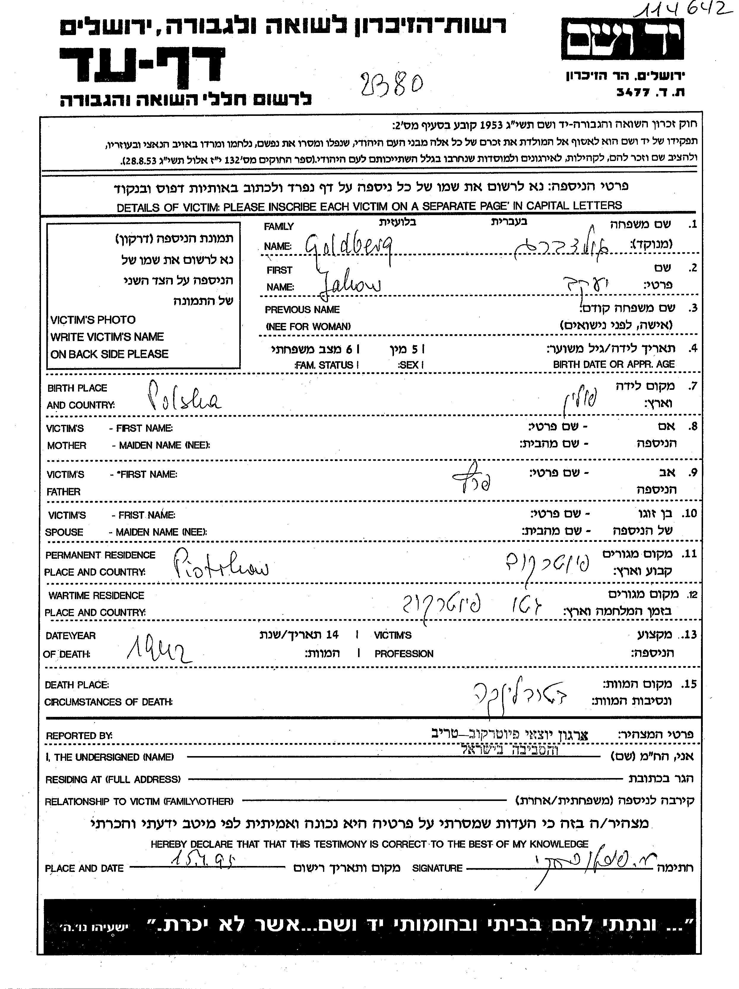 Jakow Goldberg wurde in Polen geboren. Er war der Sohn von Peretz. Vor dem Zweiten Weltkrieg lebte er in Piotrkow, Polen. Während des Krieges war er in Piotrkow, Polen.