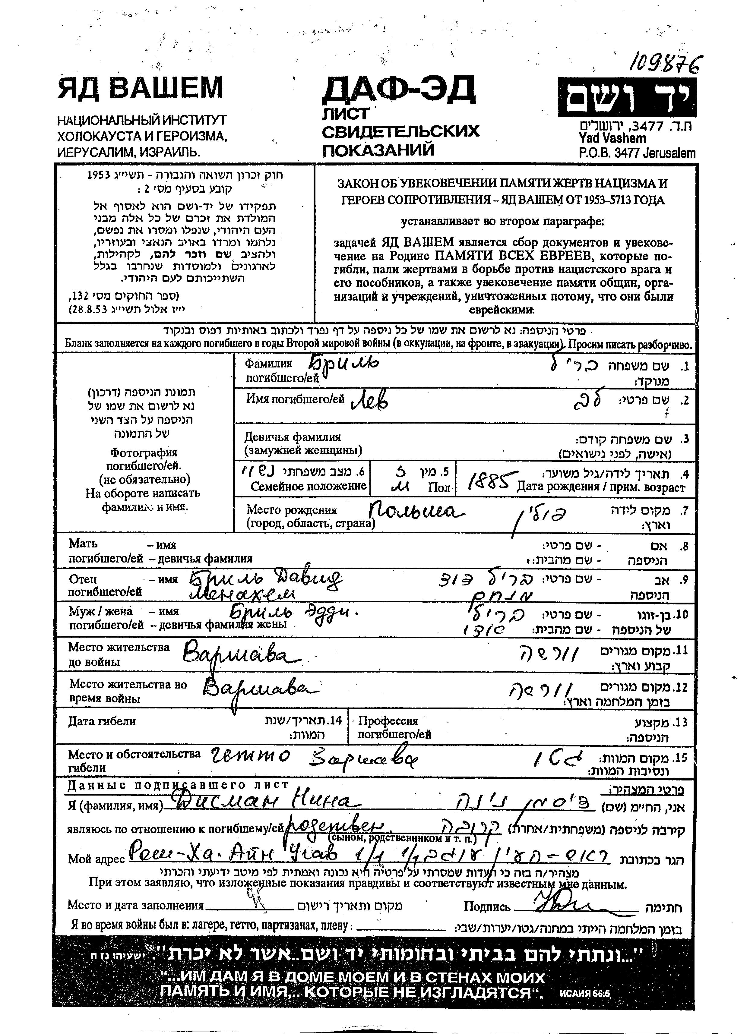 Lev Bril wurde im Jahr 1885 in Polen geboren. Er war der Sohn von David Menakhem. Er war mit Edi Edi Verheiratet. Vor dem Zweiten Weltkrieg lebte er in Warszawa, Polen. Während des Krieges war er in Warszawa, Polen.