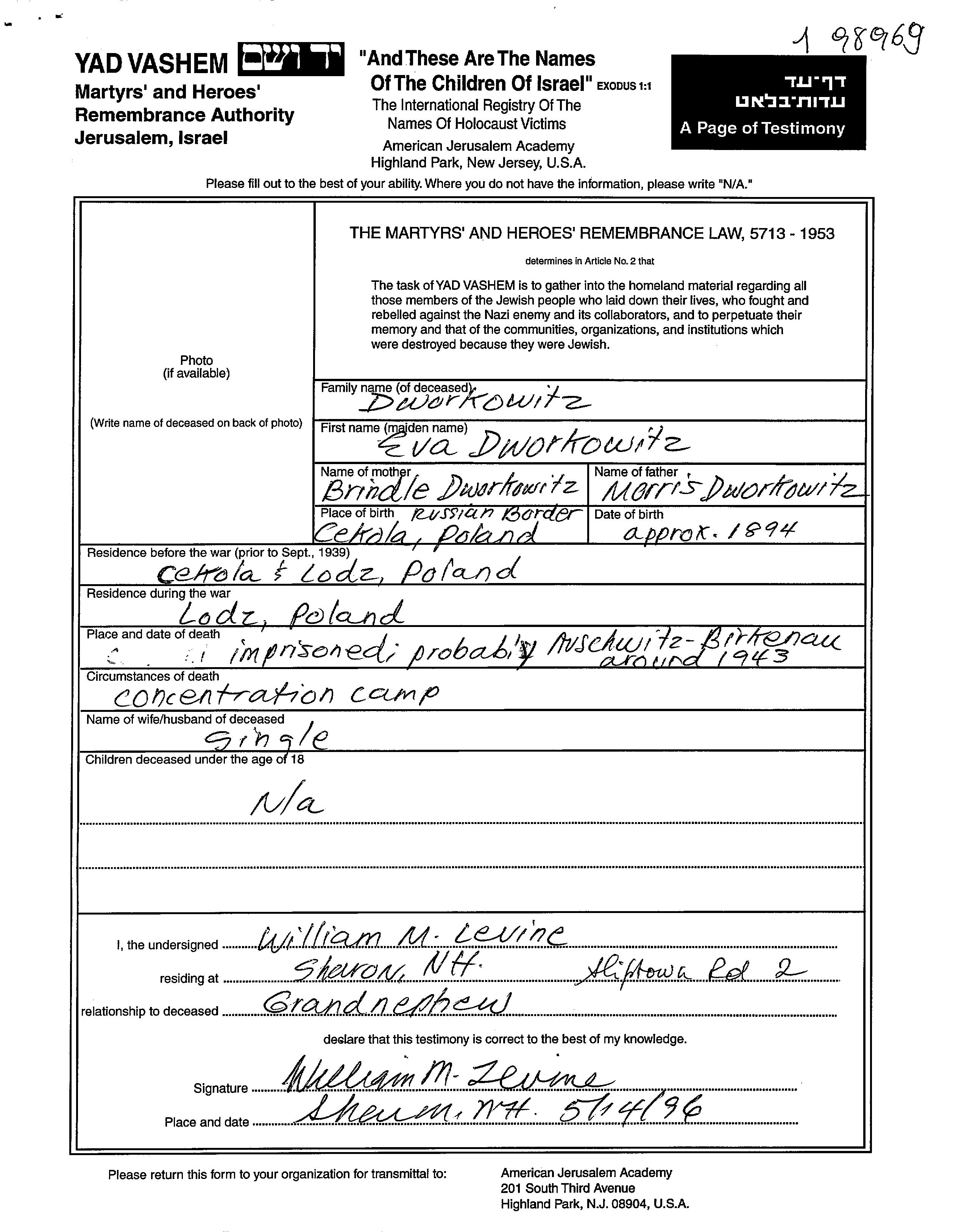 Eva Dworkowitz wurde im Jahr 1894 in Skala, Polen geboren. Sie war die Tochter von Morris und Brindle. Sie war Ledig. Vor dem Zweiten Weltkrieg lebte sie in Skala, Polen. Während des Krieges war sie in Lodz, Polen.