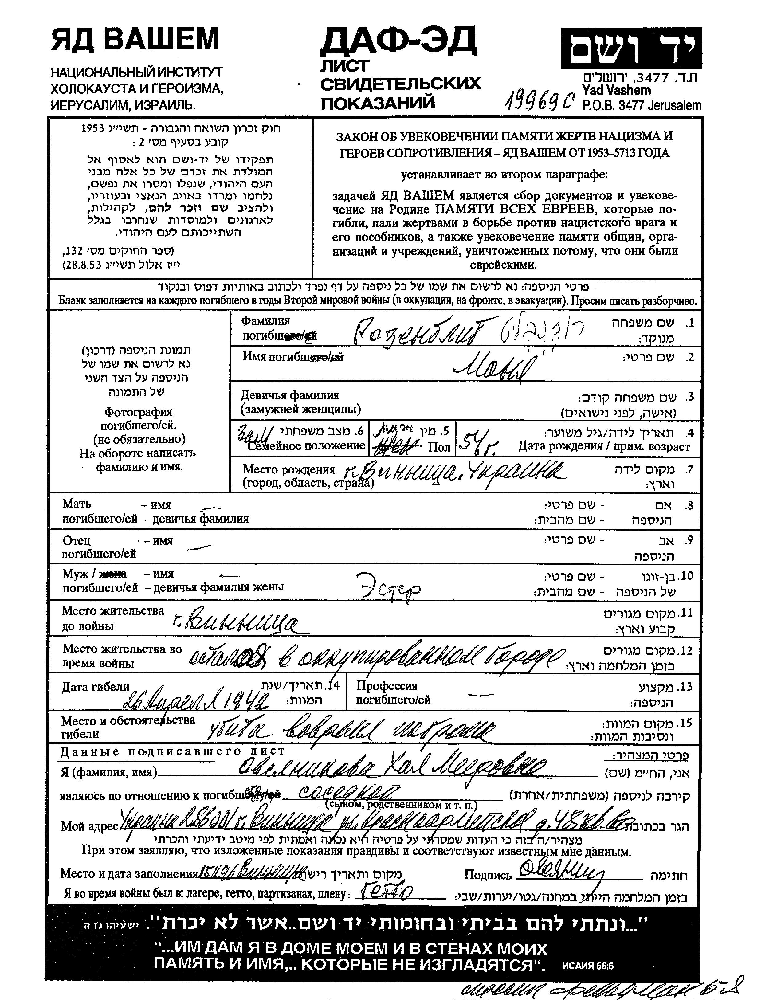 Monya Rozenblit wurde im Jahr 1888 in Vinnitsa, Ukraine (UdSSR) geboren. Er war mit Ester Verheiratet. Vor dem Zweiten Weltkrieg lebte er in Vinnitsa, Ukraine (UdSSR). Während des Krieges war er in Vinnitsa, Ukraine (UdSSR).