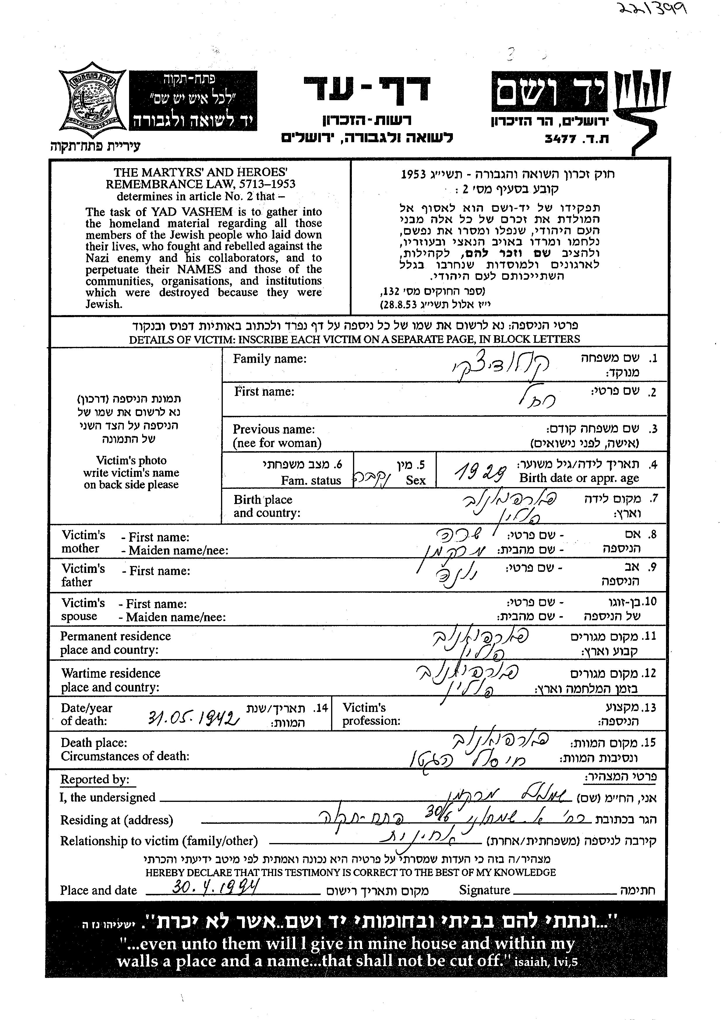 Suche nach einem Todesjahr im Zeitraum der Holocaust: 1933 bis 1945. Bitte wählen Sie 'Exakt' im Auswahlmenü, um nur nach einem einzelnen Jahr zu suchen, alternativ können Sie die flexibleren Optionen '+/- 2 Jahre' oder '+/- 5 Jahre' wählen.