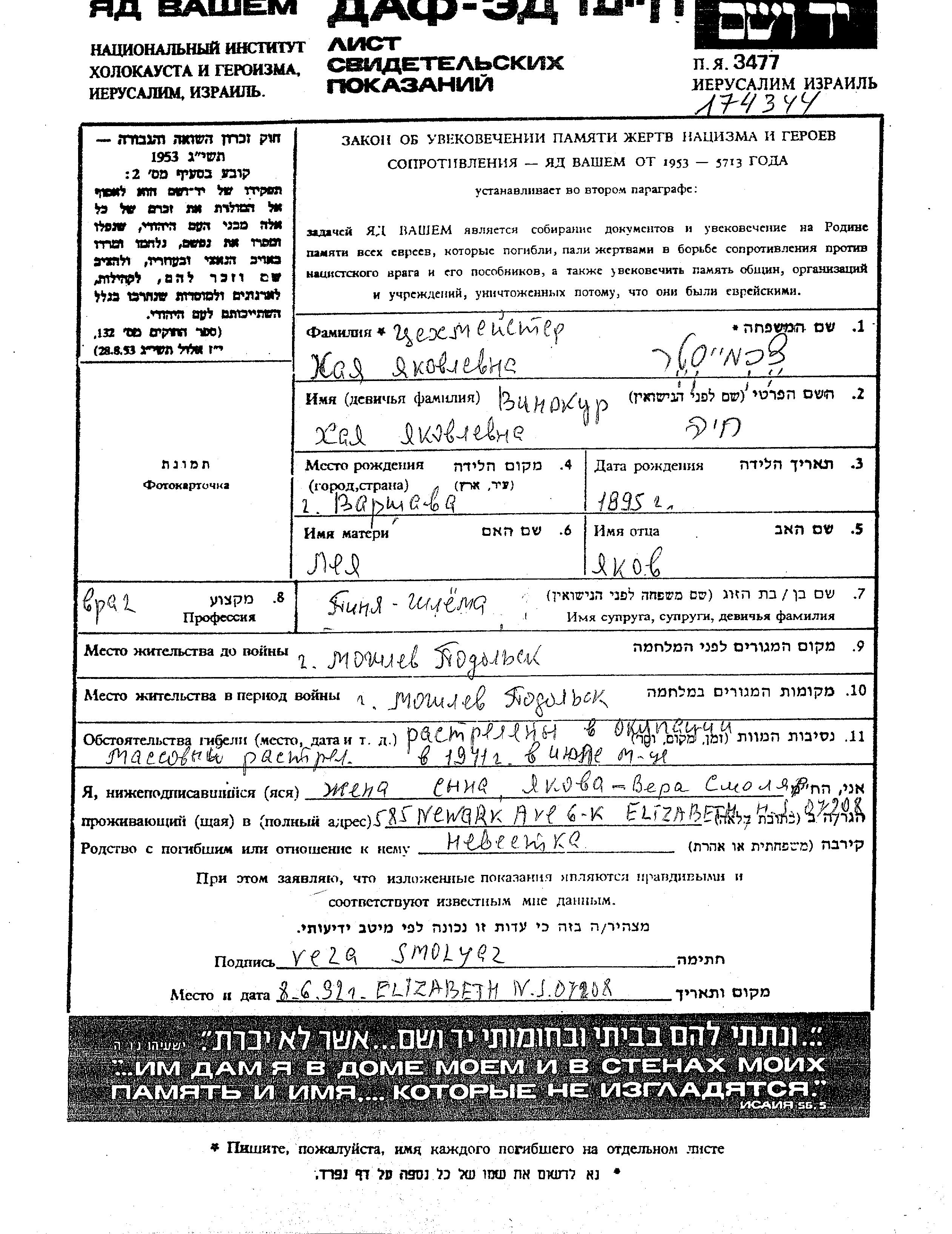 Khaia Tzekhmeister, geb. Vinokur wurde im Jahr 1895 in Warszawa, Polen geboren. Sie war die Tochter von Yakov und Lea. Sie war Arzt/ärztin und mit Pinkhes Shlyoma Verheiratet. Vor dem Zweiten Weltkrieg lebte sie in Mogilev Podolski, Ukraine (UdSSR). Während des Krieges war sie in Mogilev Podolski, Ukraine (UdSSR).