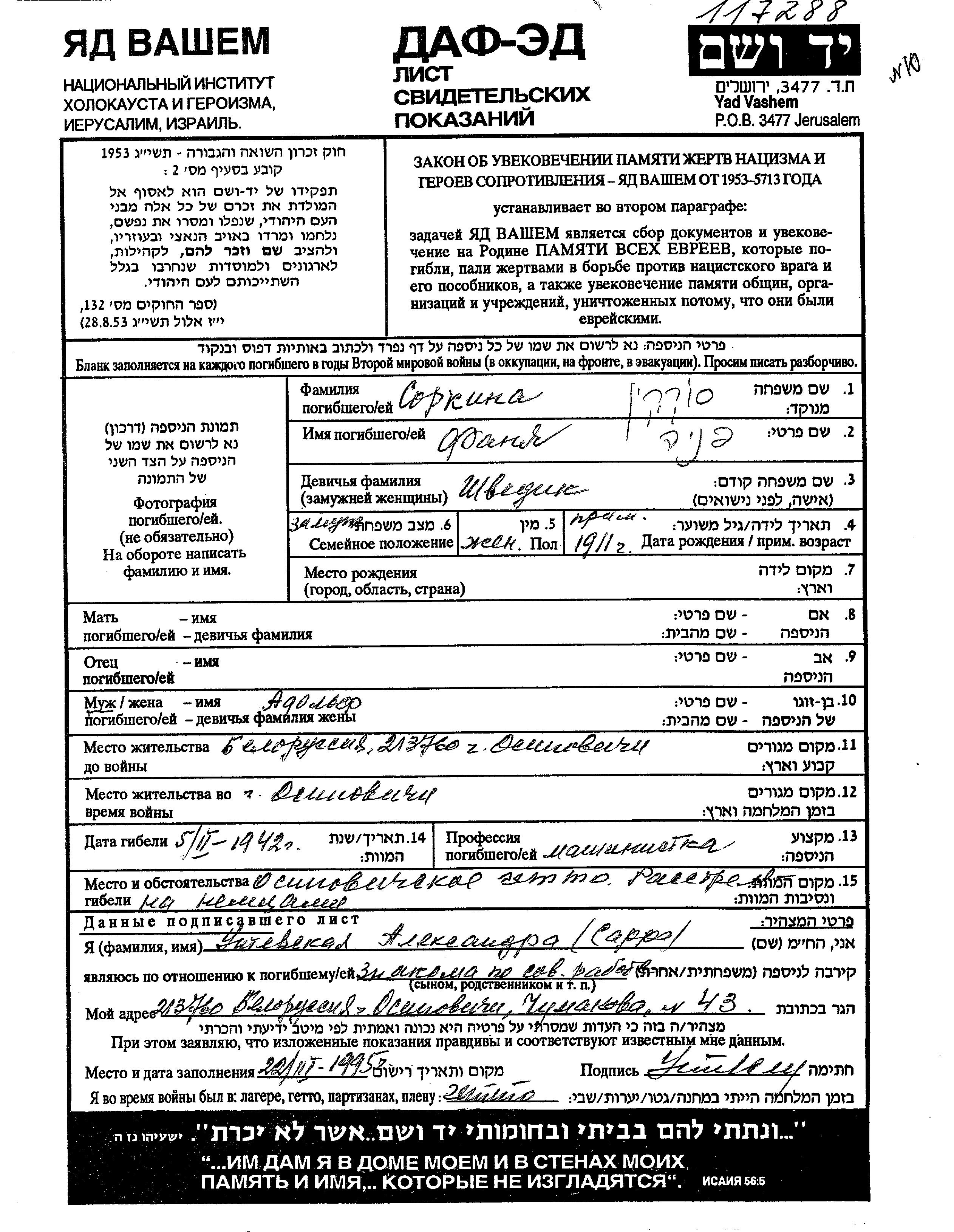 Sorkin Fania 1911 Osipovichi, Weißrussland (UdSSR) Gedenkblatt