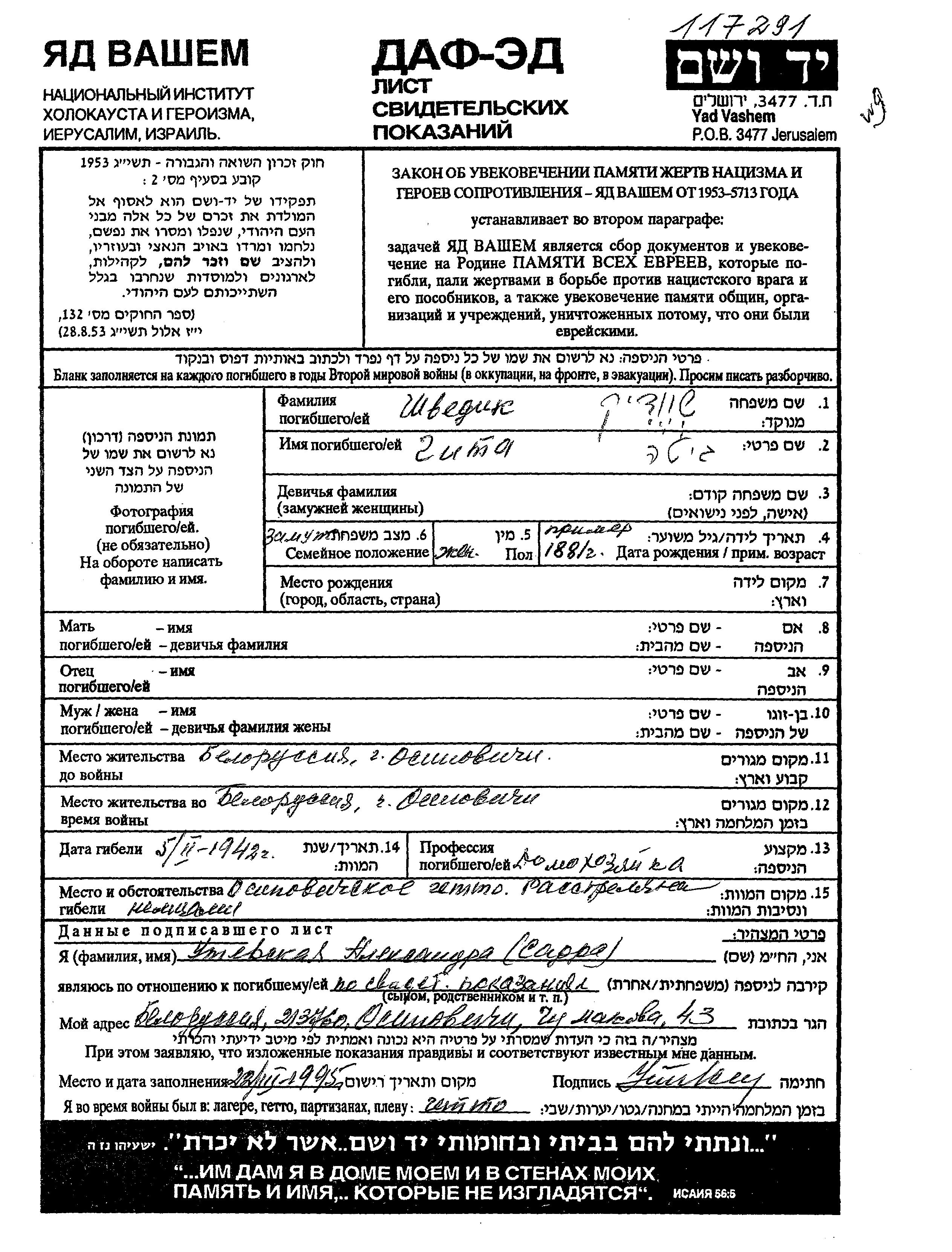 Gita Shvedik wurde im Jahr 1881 geboren. Sie war Hausfrau und Verheiratet. Vor dem Zweiten Weltkrieg lebte sie in Osipovichi, Weißrussland (UdSSR). Während des Krieges war sie in Osipovichi, Weißrussland (UdSSR).