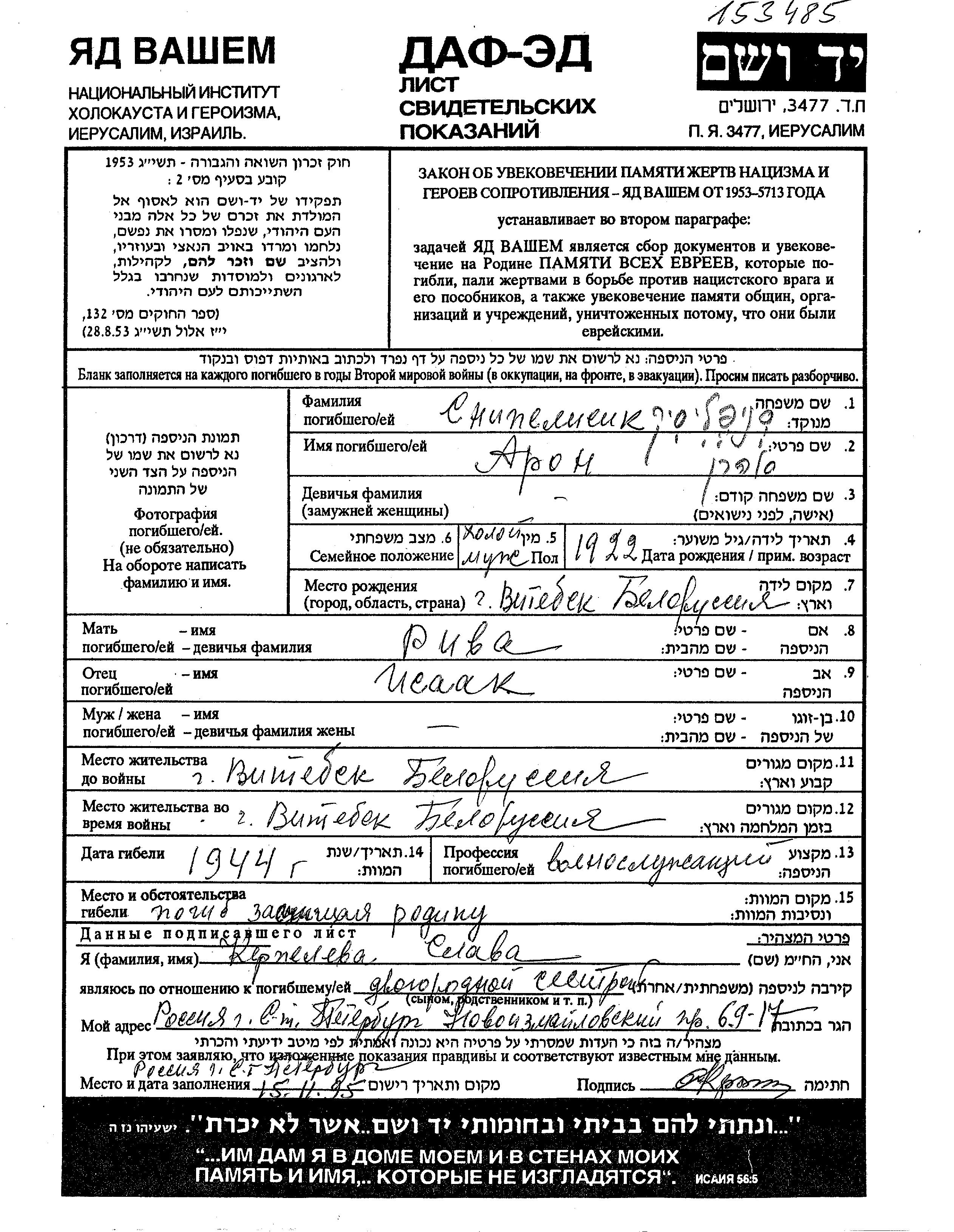 Aron Snipelisik wurde im Jahr 1922 in Vitebsk, Weißrussland (UdSSR) geboren. Er war der Sohn von Isaak und Riva, geb. Nisilevich. Er war Soldat und Ledig. Vor dem Zweiten Weltkrieg lebte er in Vitebsk, Weißrussland (UdSSR). Während des Krieges war er in die Sowjetischen Streitkräfte. Aron im Militärdienst umgekommen. Todesort: unbekannt im Jahr 1944.