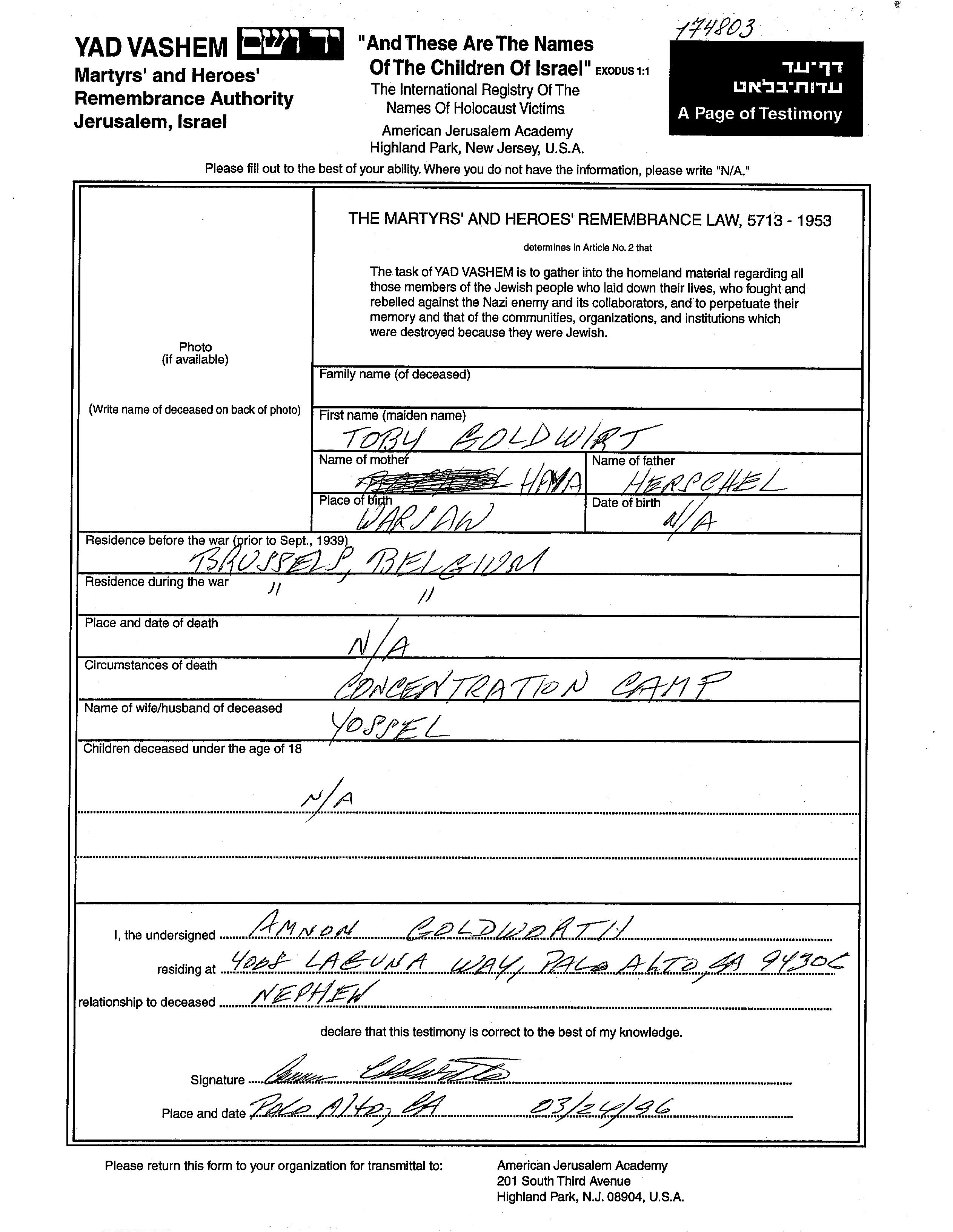 Toby Goldwirt wurde in Warszawa, Polen geboren. Sie war die Tochter von Herschel und Hana. Sie war mit Yossel Verheiratet. Vor dem Zweiten Weltkrieg lebte sie in Bruxelles, Belgien. Während des Krieges war sie in Bruxelles, Belgien.