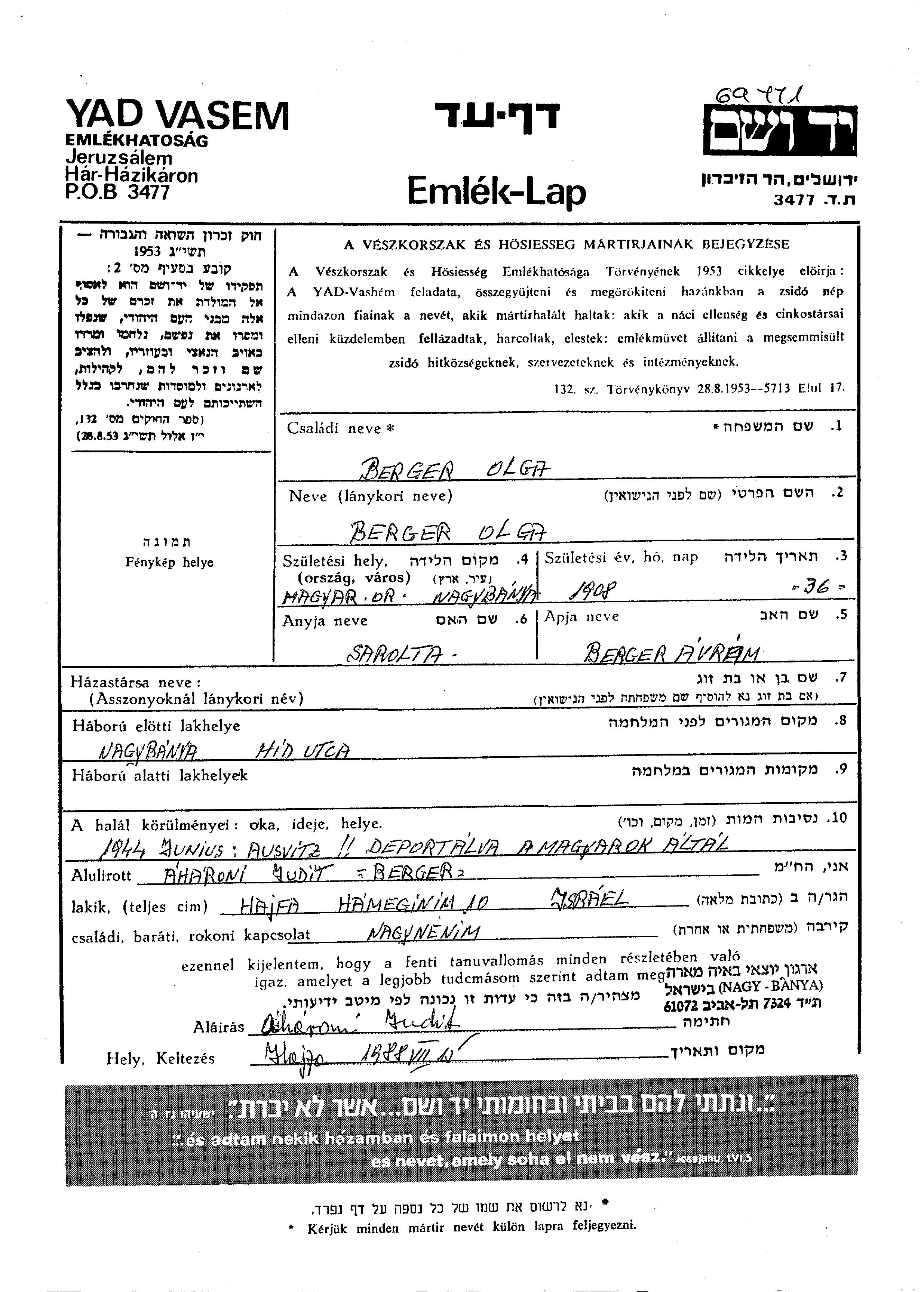 Olga Berger wurde im Jahr 1908 in Nagybánya, Rumänien geboren. Sie war die Tochter von Avram und Sarolta. Vor dem Zweiten Weltkrieg lebte sie in Nagybánya, Rumänien. Während des Krieges war sie in Nagybánya, Rumänien.
