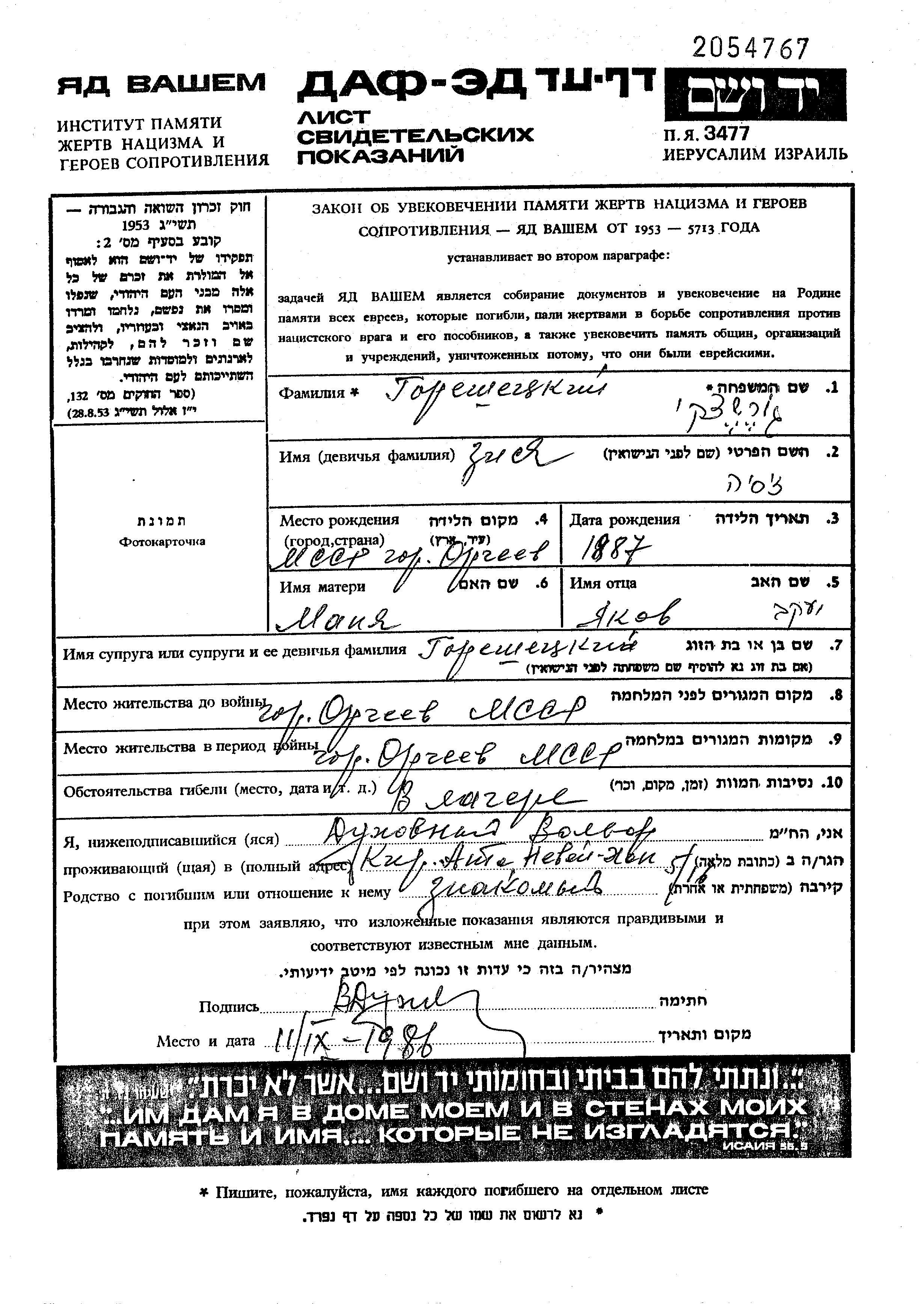 Zisia Goreshetzki wurde in Orhei, Rumänien geboren. Er war der Sohn von Yakov und Mania. Vor dem Zweiten Weltkrieg lebte er in Orhei, Rumänien. Während des Krieges war er in Orhei, Rumänien.