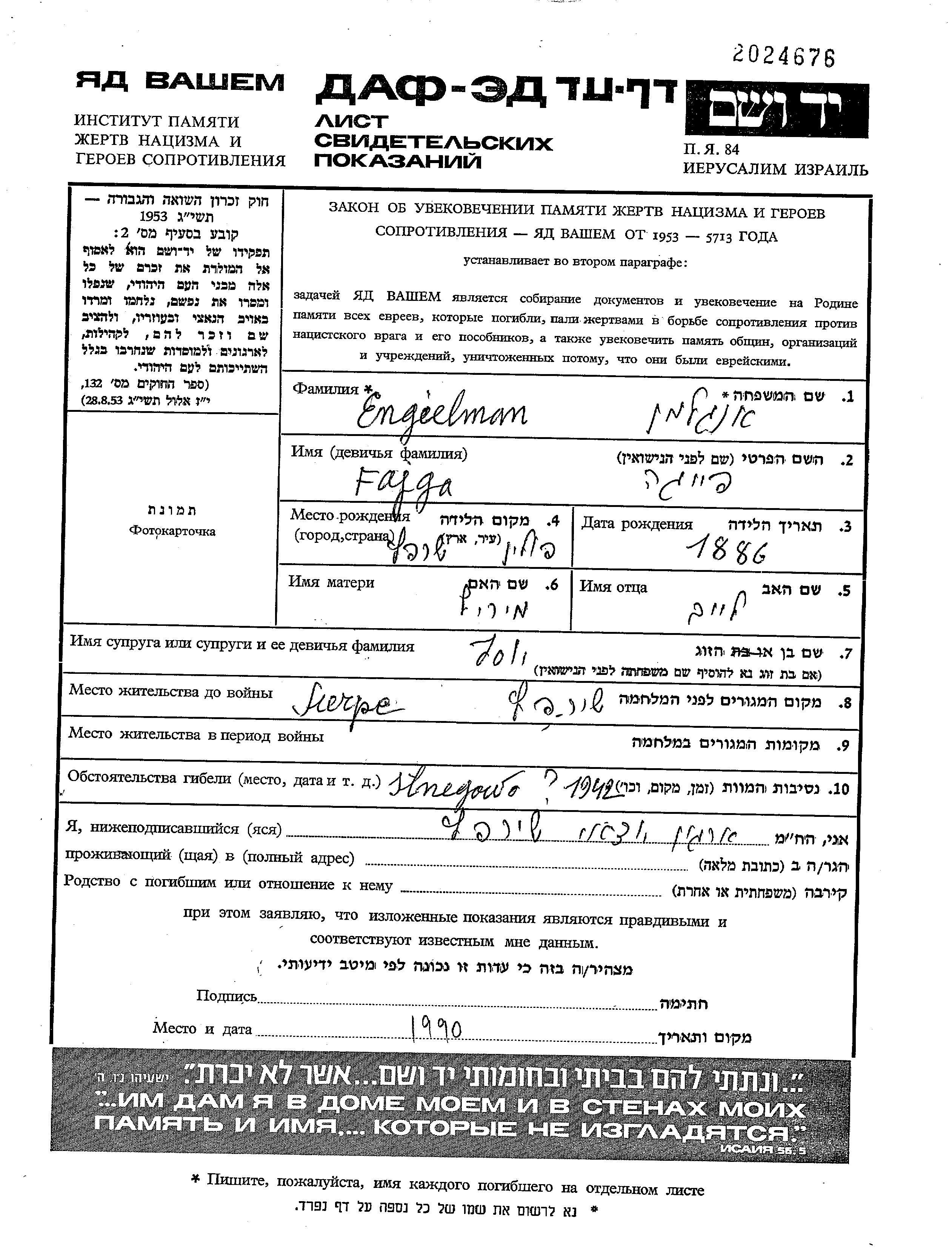 Fajga Engielman wurde im Jahr 1886 in Sierpc, Polen geboren. Sie war die Tochter von Mirl und Leib. Sie war mit Josef Verheiratet. Vor dem Zweiten Weltkrieg lebte sie in Sierpc, Polen.