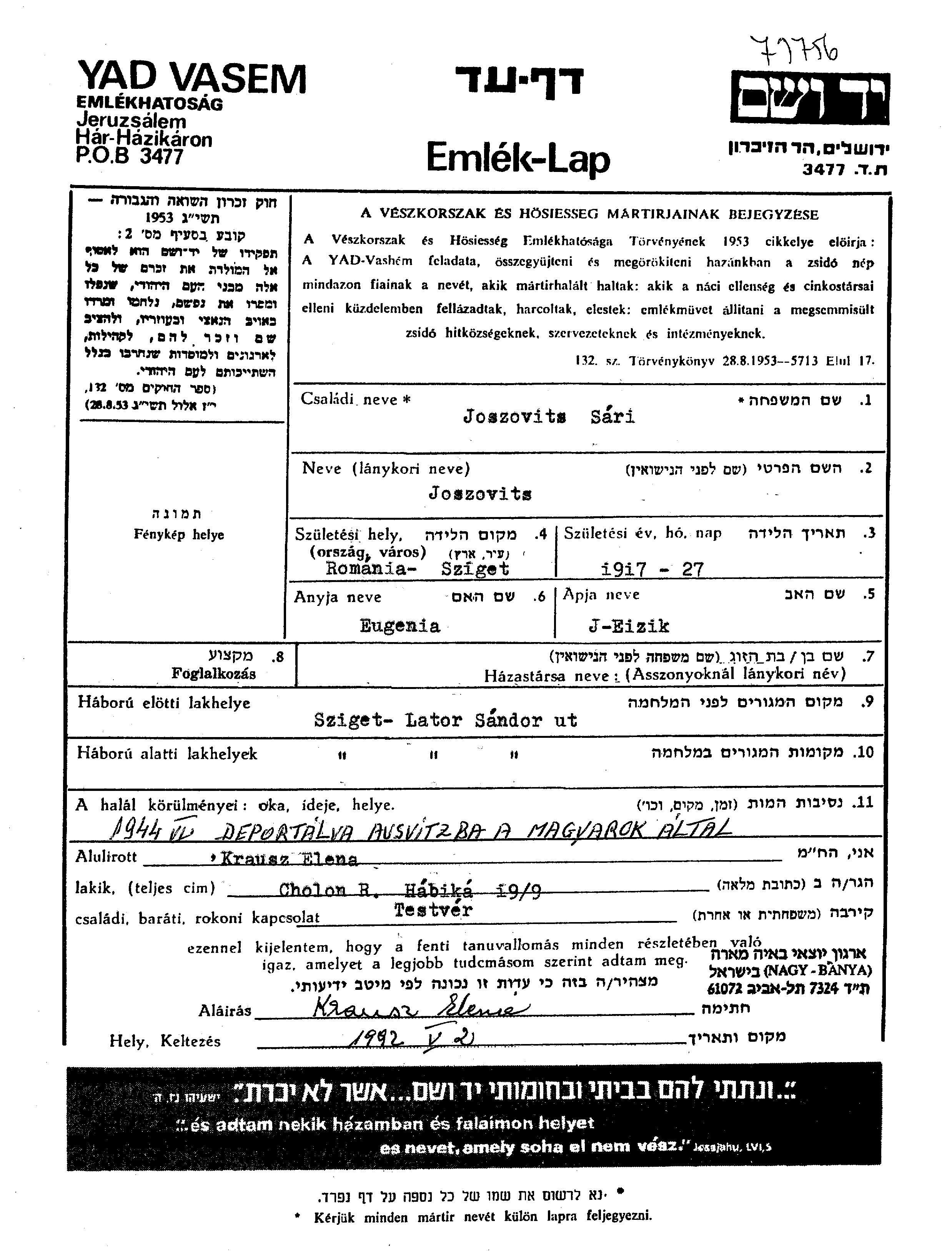 Sari Joszovits wurde im Jahr 1917 in Maramarossziget, Rumänien geboren. Sie war die Tochter von Aizik und Eugenia. Sie war Ledig. Vor dem Zweiten Weltkrieg lebte sie in Maramarossziget, Rumänien. Während des Krieges war sie in Maramarossziget, Rumänien.