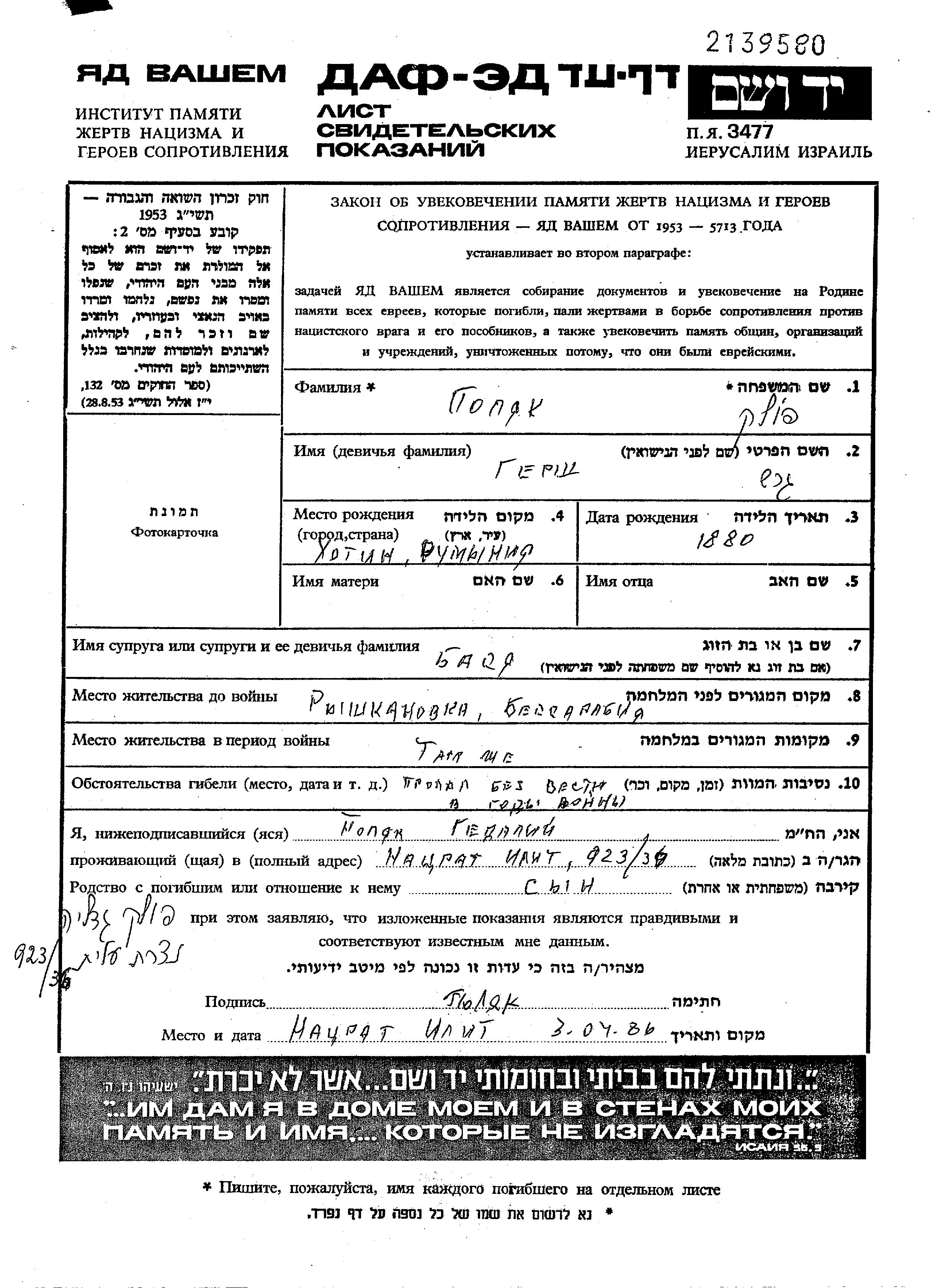 Gersh Polyak wurde in Hotin, Rumänien geboren. Er war mit Basya Verheiratet. Vor dem Zweiten Weltkrieg lebte er in Ryshkany, Rumänien. Während des Krieges war er in Ryshkany, Rumänien.