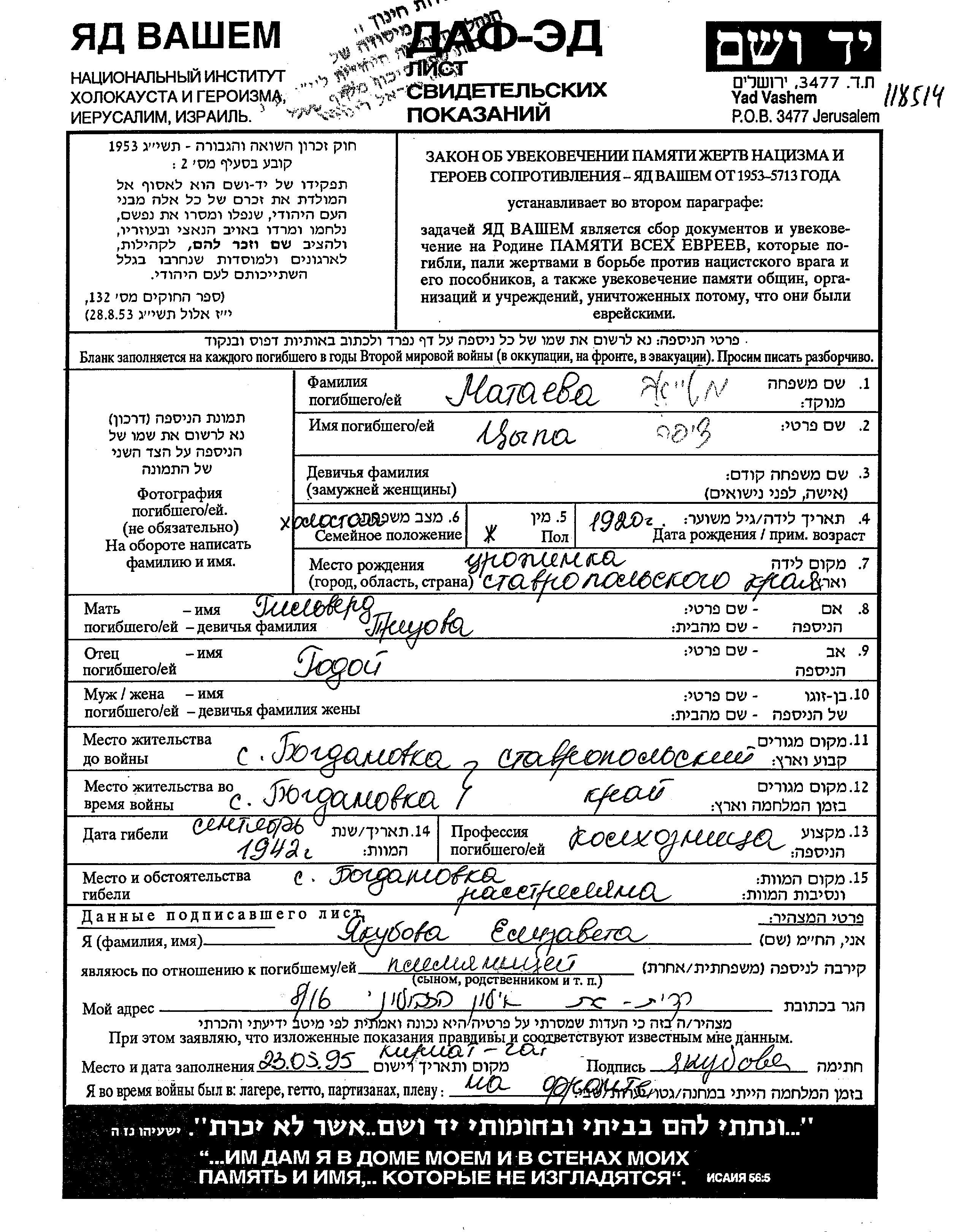 Tzypa Matayev wurde im Jahr 1920 in Ordzhonikidze, Russland (UdSSR) geboren. Sie war die Tochter von Godoi und Gilverd, geb. Prizov. Sie war Landwirt und Ledig. Vor dem Zweiten Weltkrieg lebte sie in Bogdanovka, Russland (UdSSR). Während des Krieges war sie in Bogdanovka, Russland (UdSSR).