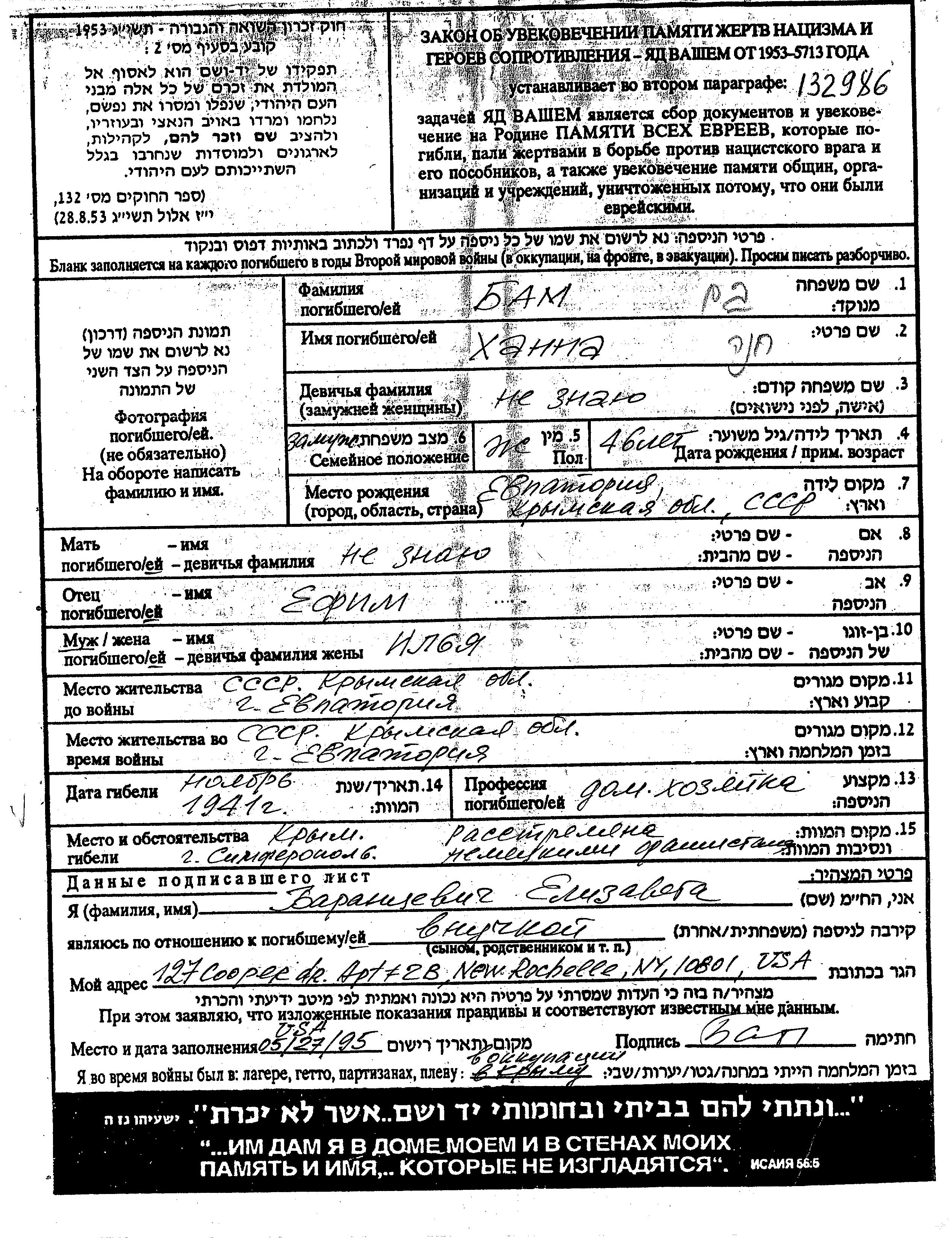 Khana Bem wurde im Jahr 1895 in Yevpatoriya, Russland (UdSSR) geboren. Sie war die Tochter von Yefim. Sie war Hausfrau und mit Ilya Verheiratet. Vor dem Zweiten Weltkrieg lebte sie in Yevpatoriya, Russland (UdSSR). Während des Krieges war sie in Yevpatoriya, Russland (UdSSR).