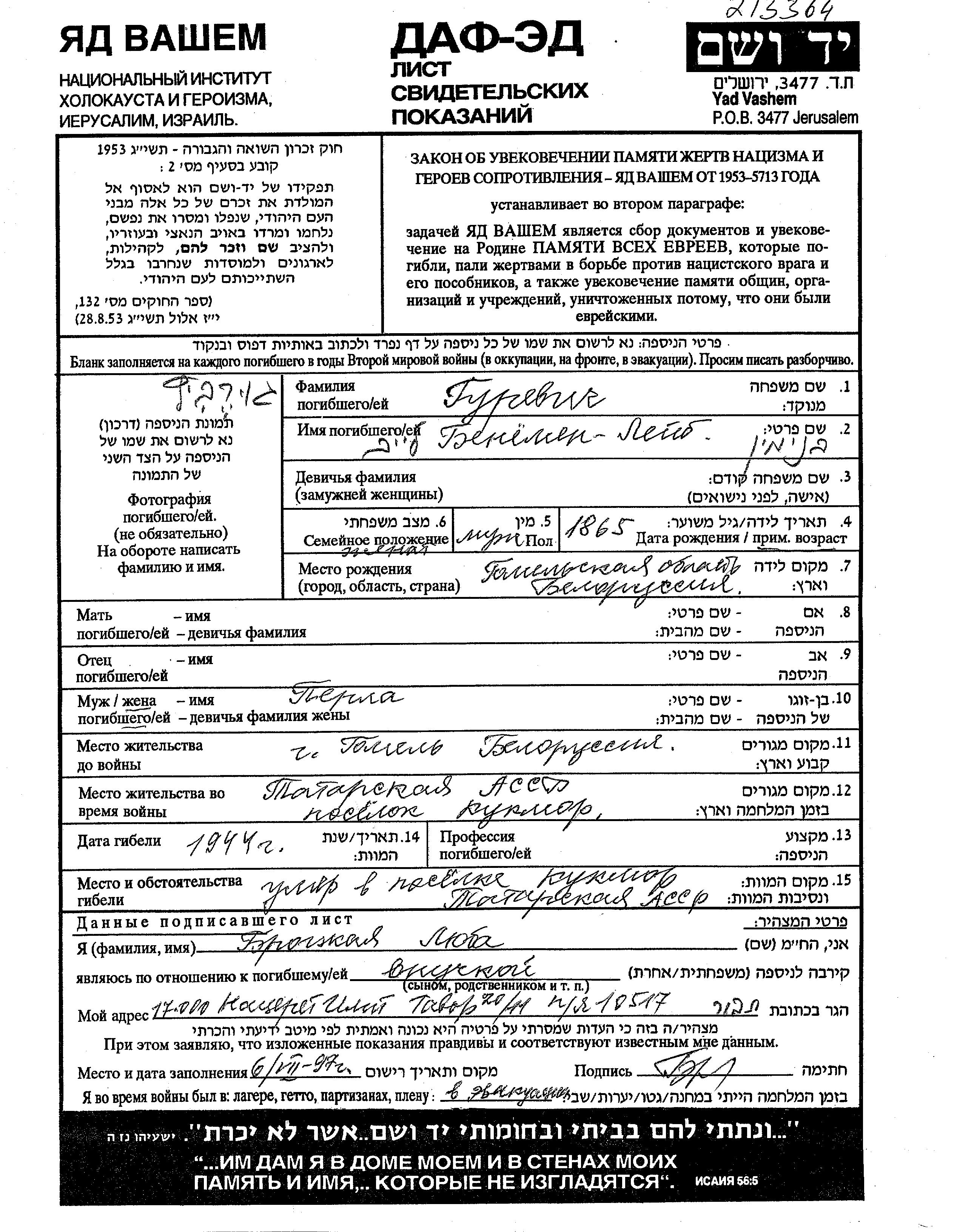 Beniomen Leib Gurevich wurde im Jahr 1865 in Gomel, Weißrussland (UdSSR) geboren. Er war mit Perla Verheiratet. Vor dem Zweiten Weltkrieg lebte er in Gomel, Weißrussland (UdSSR). Während des Krieges war er in Kukmor, Russland (UdSSR).