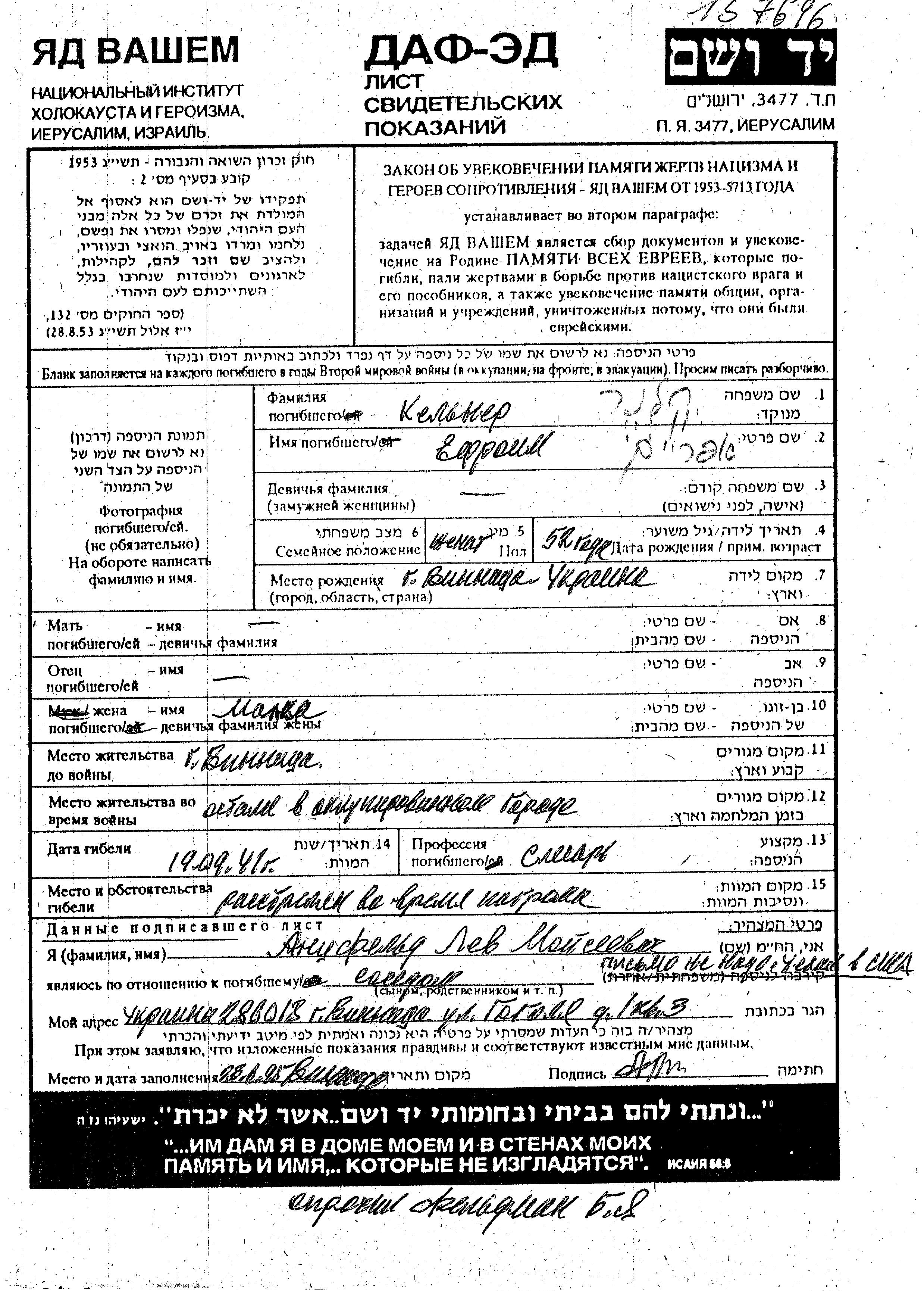 Efroim Kelner Klaner wurde im Jahr 1889 in Vinnitsa, Ukraine (UdSSR) geboren. Er war Schlosser und mit Malka Verheiratet. Vor dem Zweiten Weltkrieg lebte er in Vinnitsa, Ukraine (UdSSR). Während des Krieges war er in Vinnitsa, Ukraine (UdSSR).
