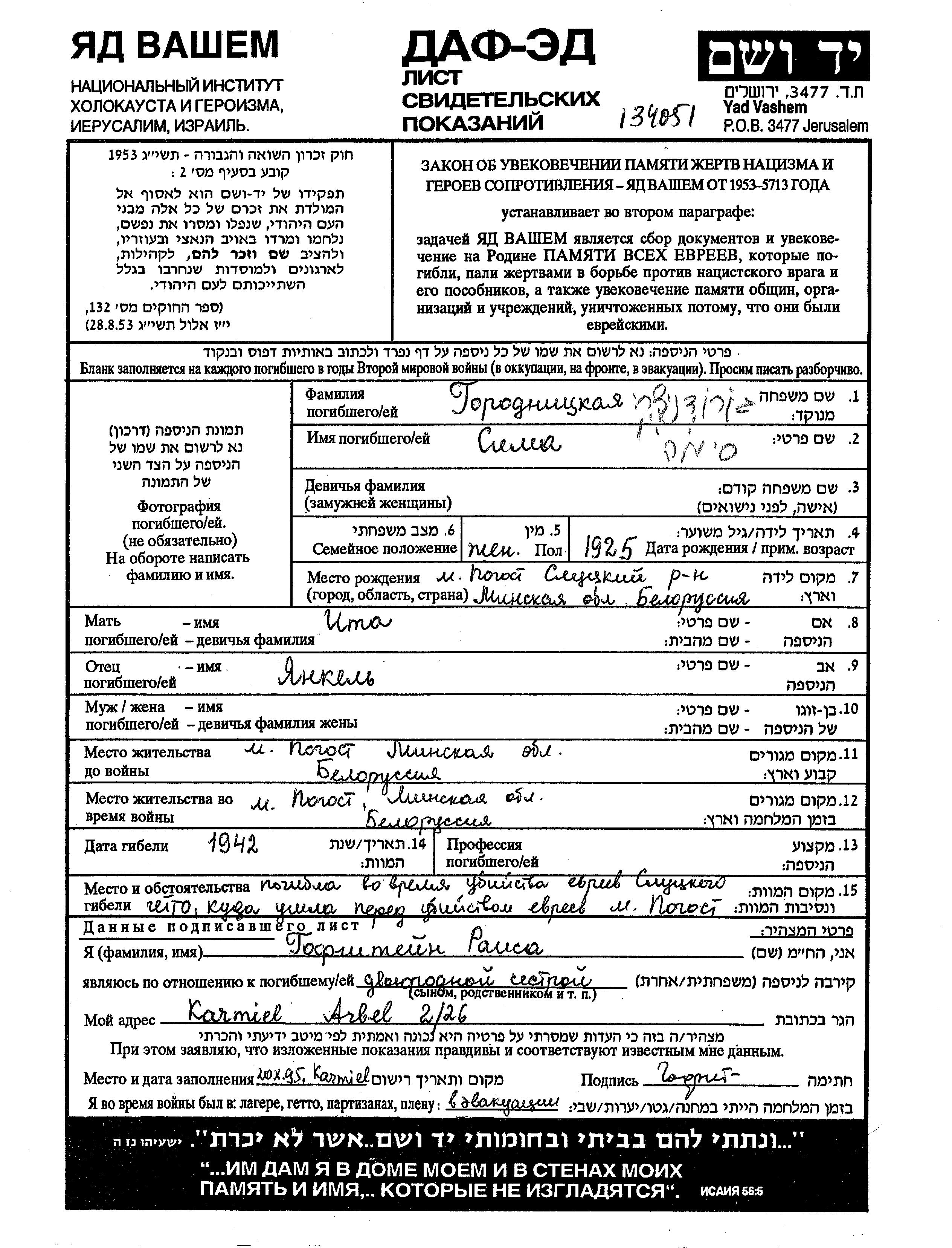 Sima Gorodnitzki wurde im Jahr 1925 in Pogost (Town), Weißrussland (UdSSR) geboren. Sie war die Tochter von Yankel und Ita. Sie war Kind. Vor dem Zweiten Weltkrieg lebte sie in Pogost (Town), Weißrussland (UdSSR). Während des Krieges war sie in Pogost (Town), Weißrussland (UdSSR).
