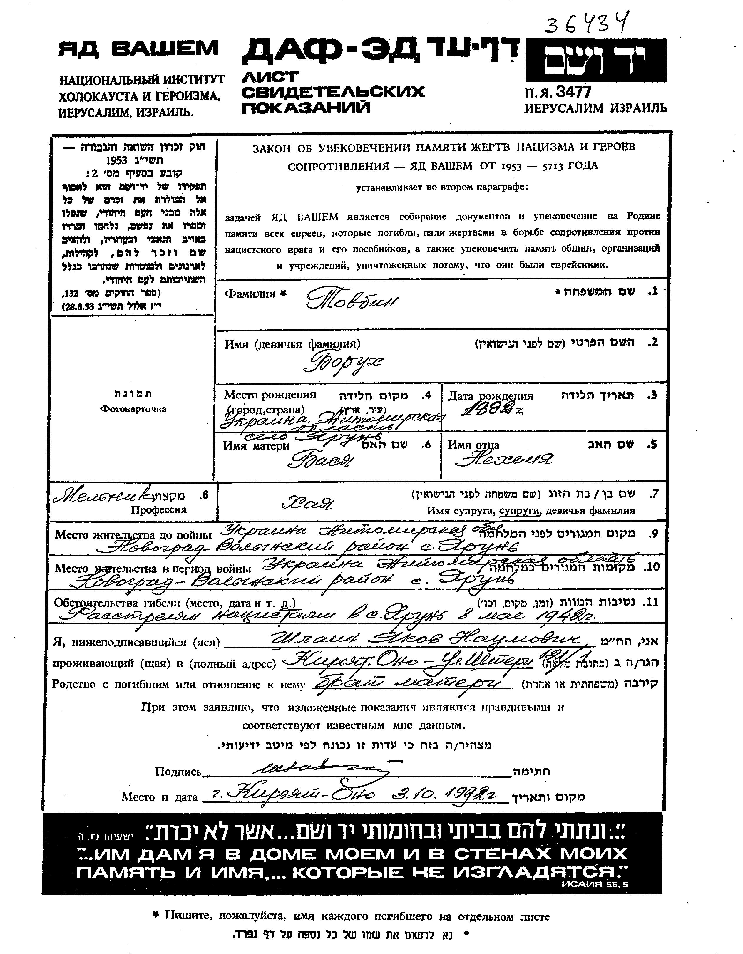 Tovbin Barukh 1882 Yarun, Ukraine (UdSSR) Gedenkblatt
