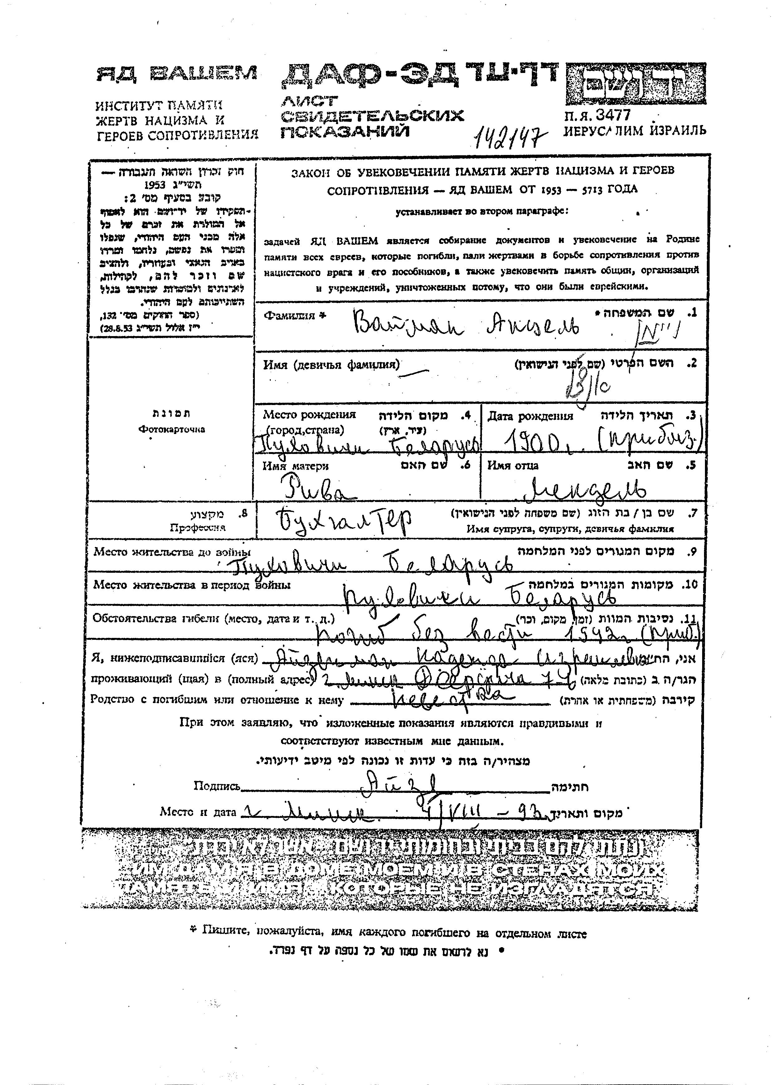 Antzel Vayman wurde im Jahr 1900 in Pukhovichi, Weißrussland (UdSSR) geboren. Er war der Sohn von Mendel und Riva. Vor dem Zweiten Weltkrieg lebte er in Pukhovichi, Weißrussland (UdSSR). Während des Krieges war er in Pukhovichi, Weißrussland (UdSSR).