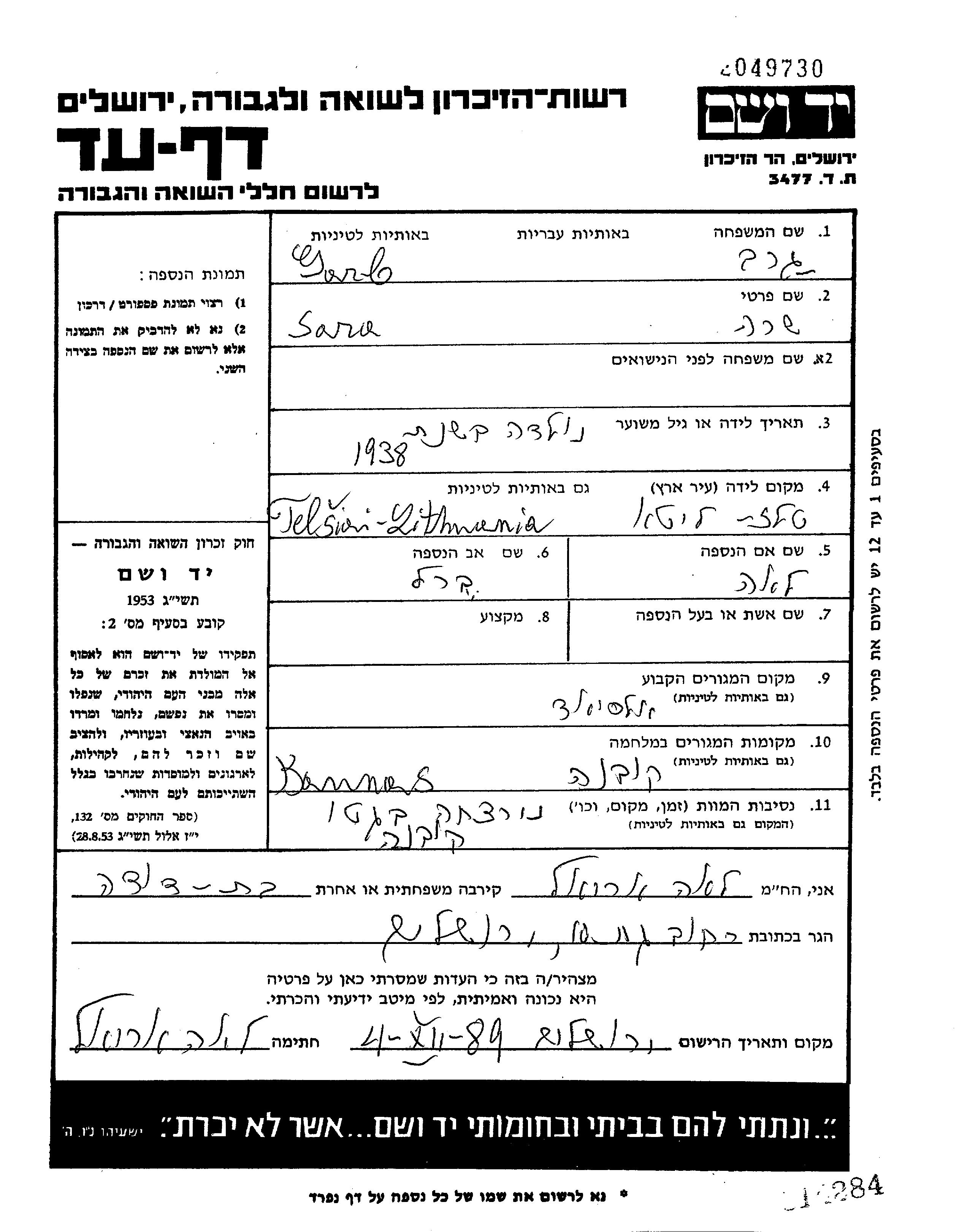 Sara wurde in der Schoah ermordet. Todesort: Kowno, Litauen.