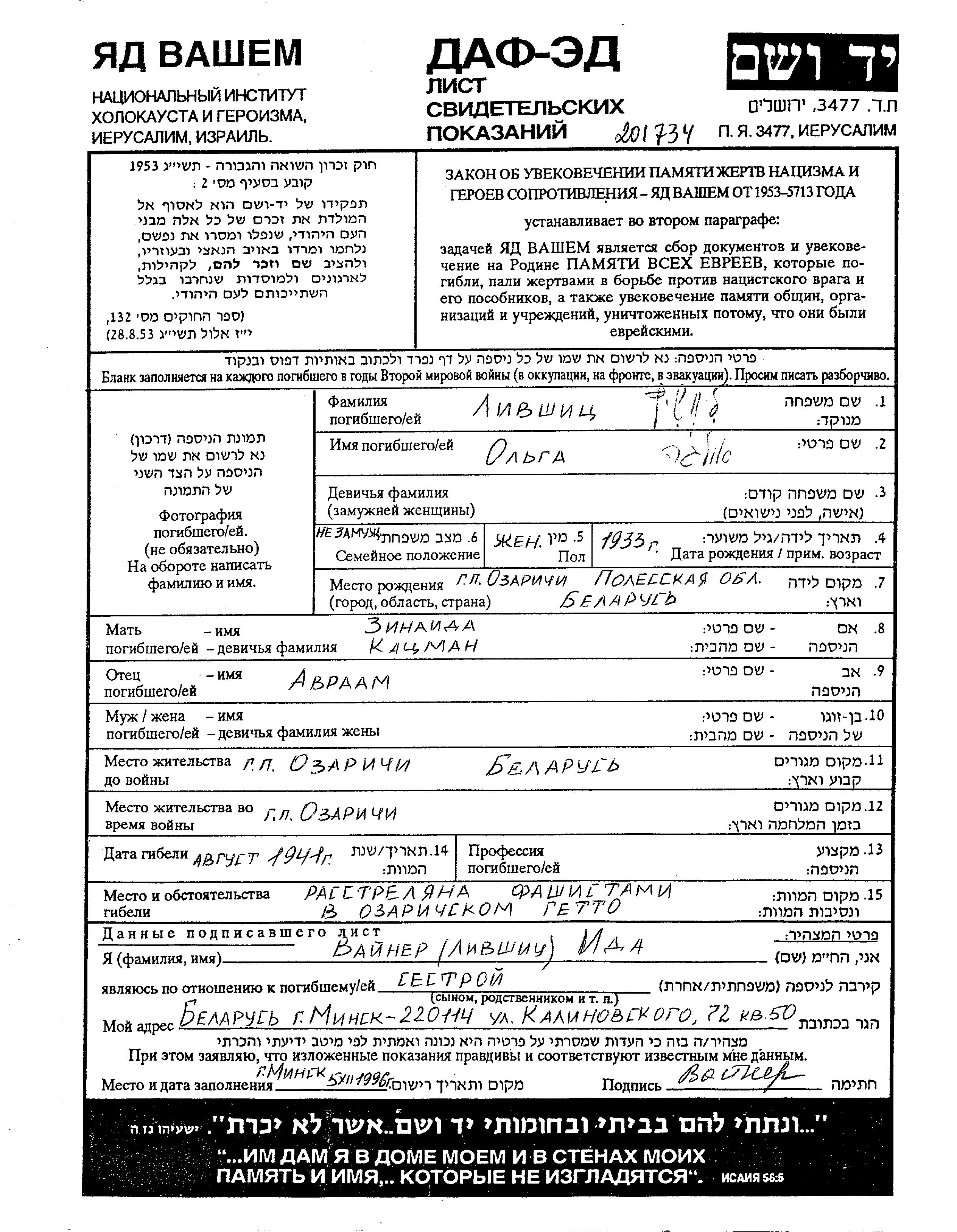 Livshitz Olga 1933 Ozarichi, Weißrussland (UdSSR) Gedenkblatt
