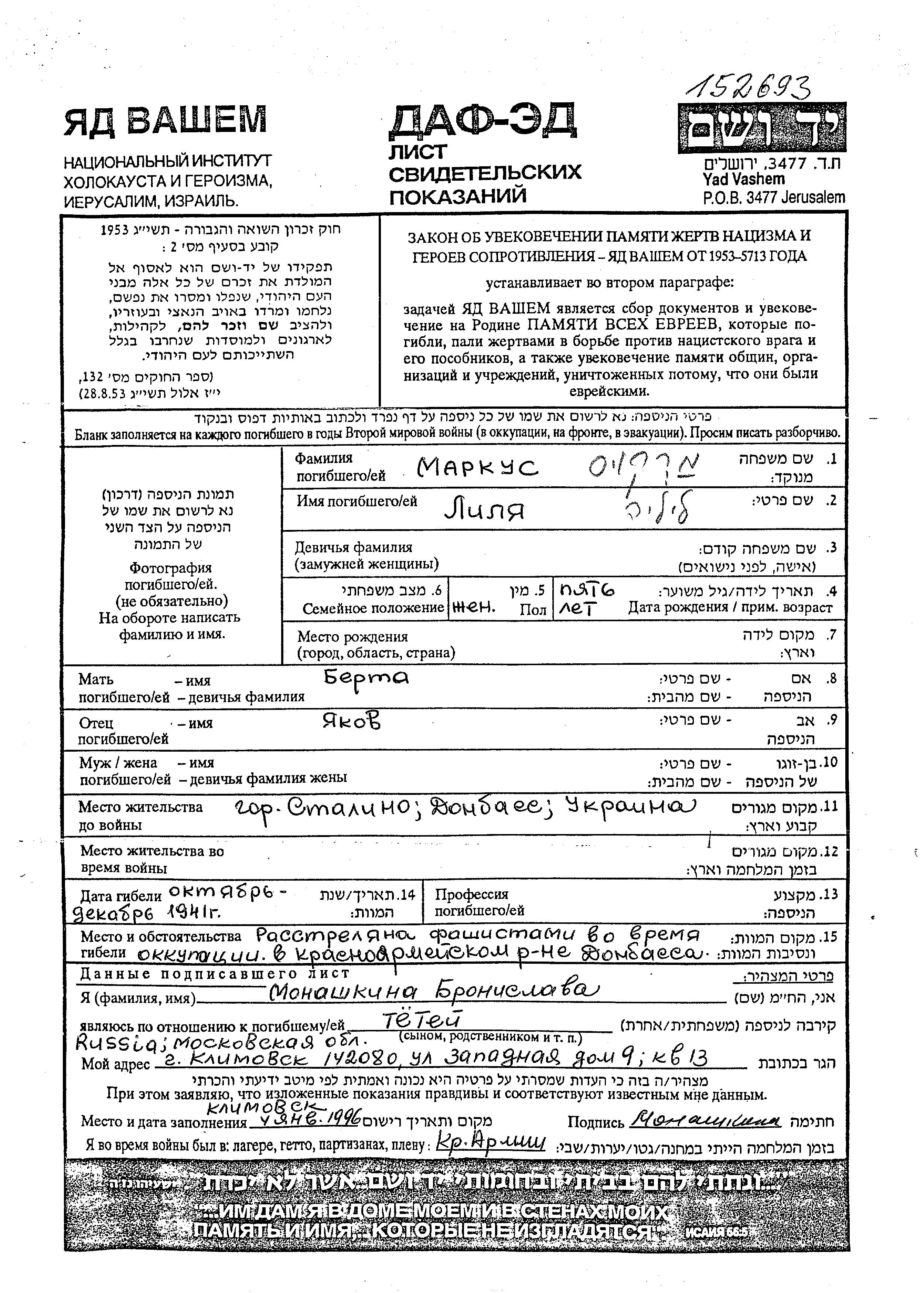 Lilia Markus wurde im Jahr 1936 geboren. Sie war die Tochter von Yakov und Berta, geb. Monashkina. Sie war Kind. Vor dem Zweiten Weltkrieg lebte sie in Stalino, Ukraine (UdSSR). Während des Krieges war sie in Stalino, Ukraine (UdSSR).
