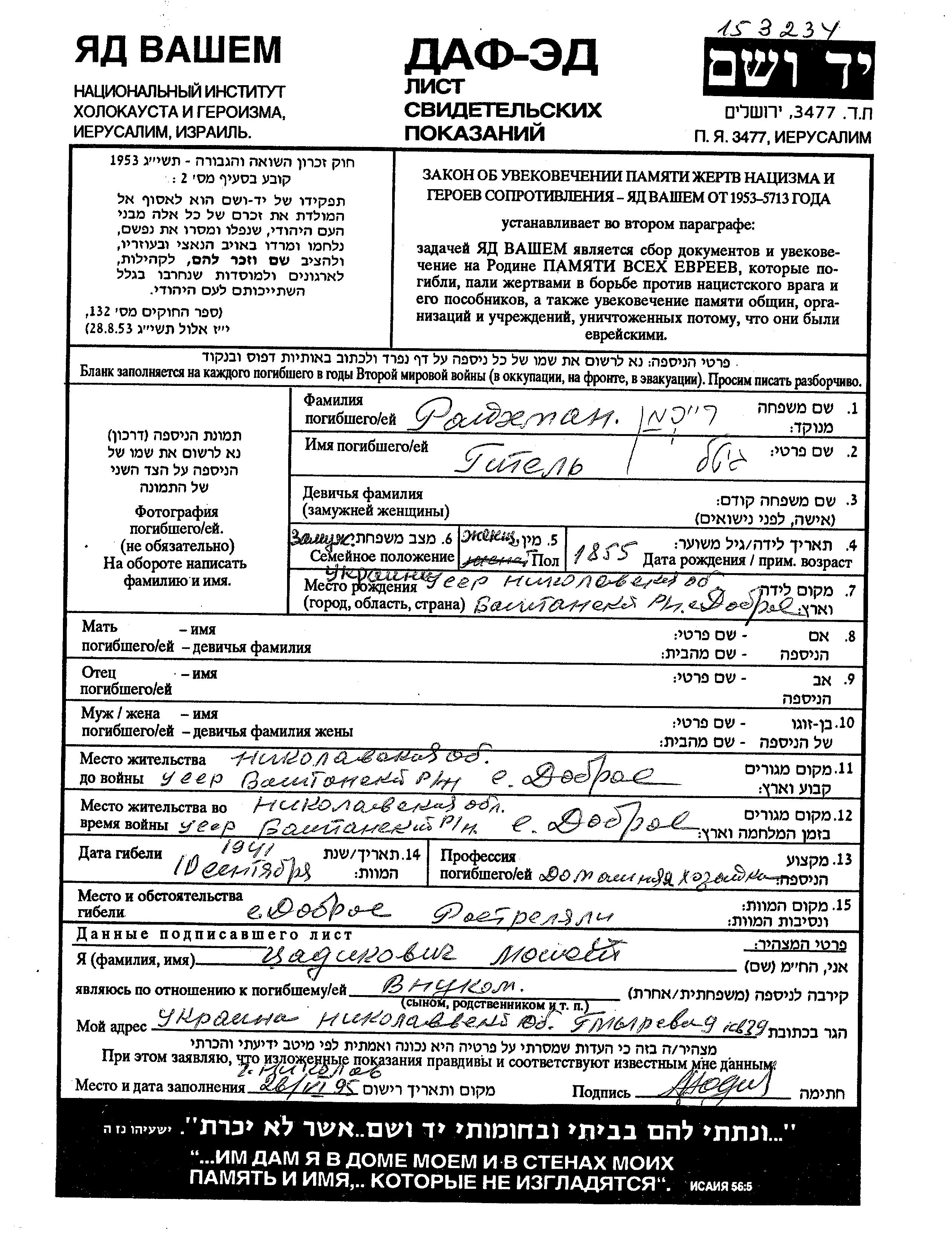 Gitel Raikhman wurde im Jahr 1855 in Dobroye, Ukraine (UdSSR) geboren. Sie war Hausfrau und mit Mordke Verheiratet. Vor dem Zweiten Weltkrieg lebte sie in Dobroye, Ukraine (UdSSR). Während des Krieges war sie in Dobroye, Ukraine (UdSSR).