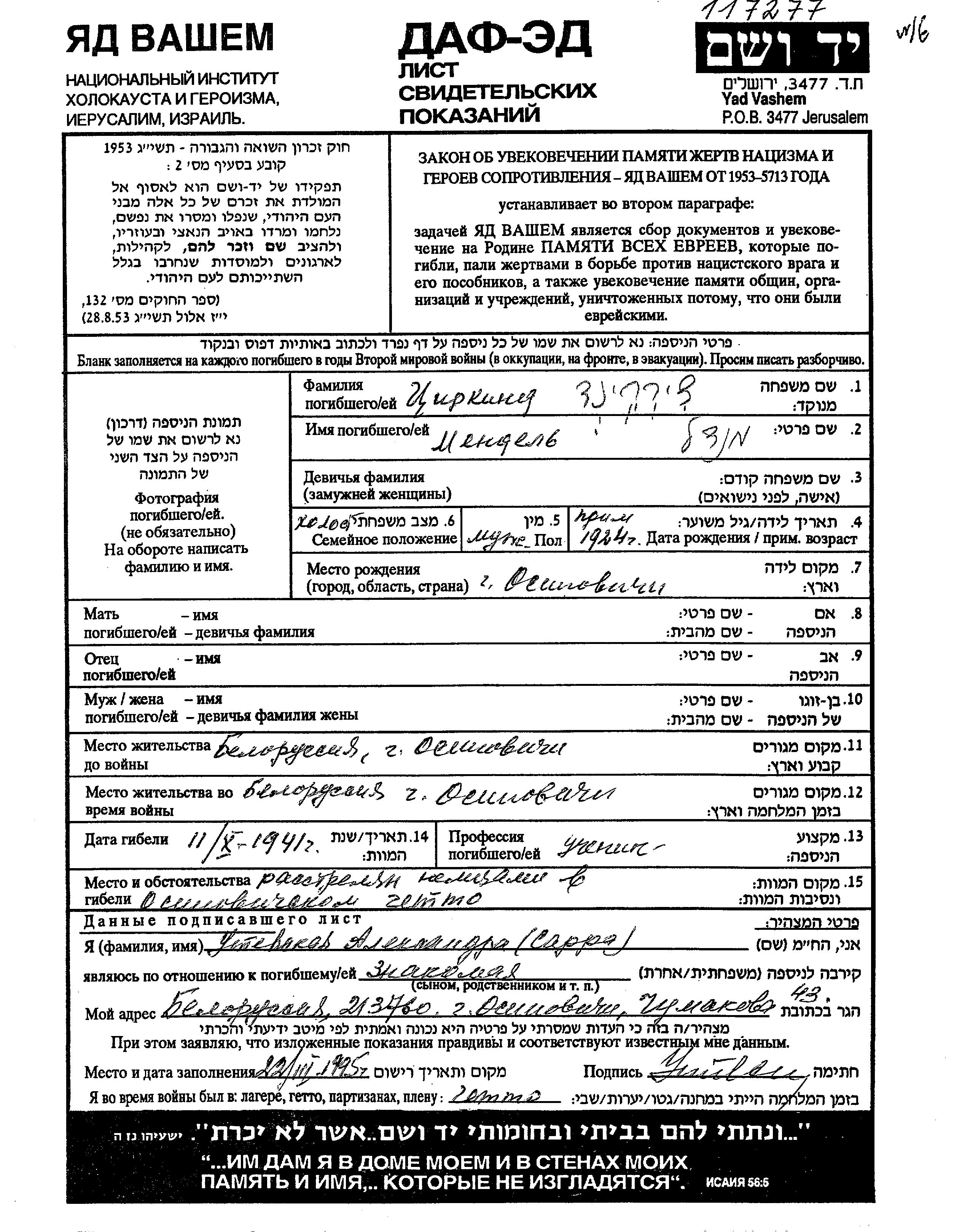 Tzirkind Mendel 1924 Osipovichi, Weißrussland (UdSSR) Gedenkblatt