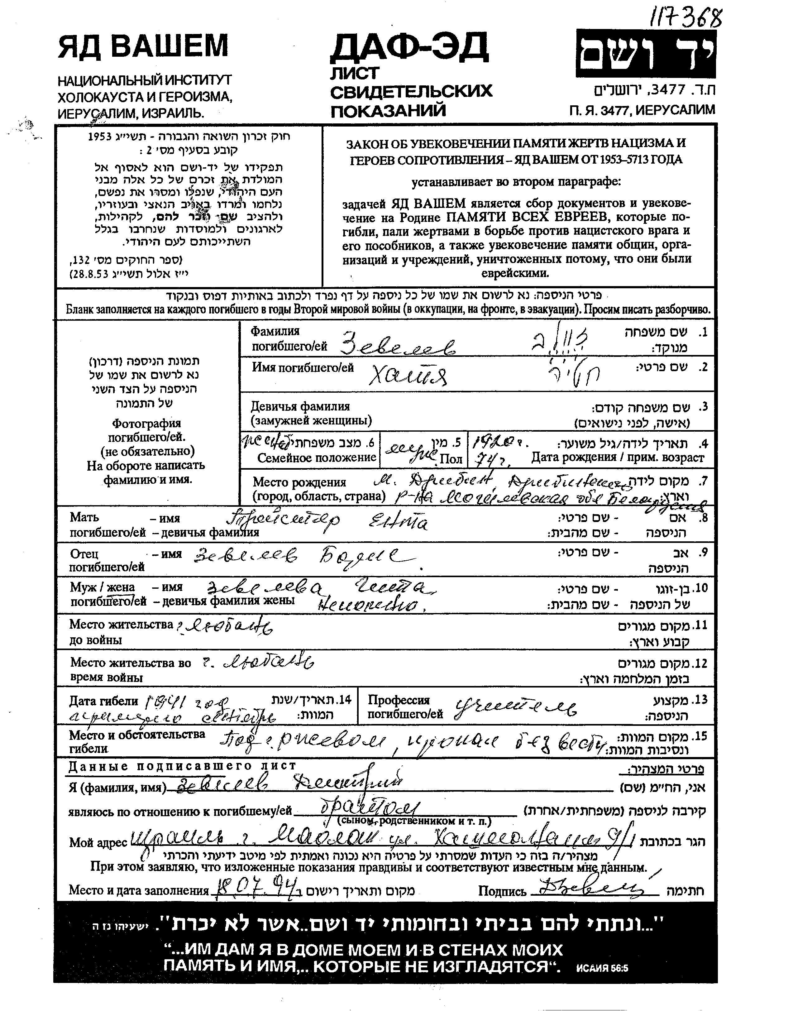 Khatia Zevelev wurde im Jahr 1920 in Dribin, Weißrussland (UdSSR) geboren. Sie war die Tochter von Boris und Yenta, geb. Treyster. Sie war Lehrer/in und mit Gita Verheiratet. Vor dem Zweiten Weltkrieg lebte sie in Lyuban, Weißrussland (UdSSR). Während des Krieges war sie in die Sowjetischen Streitkräfte.
